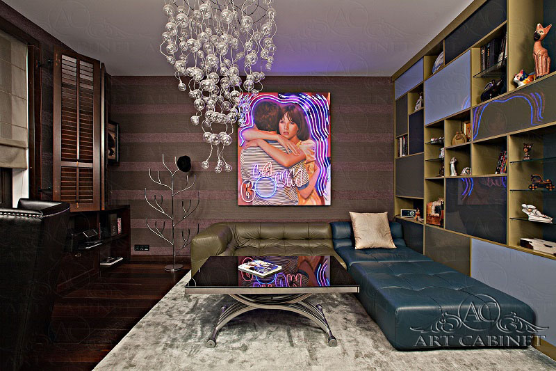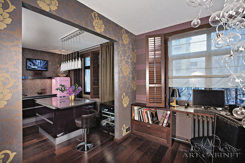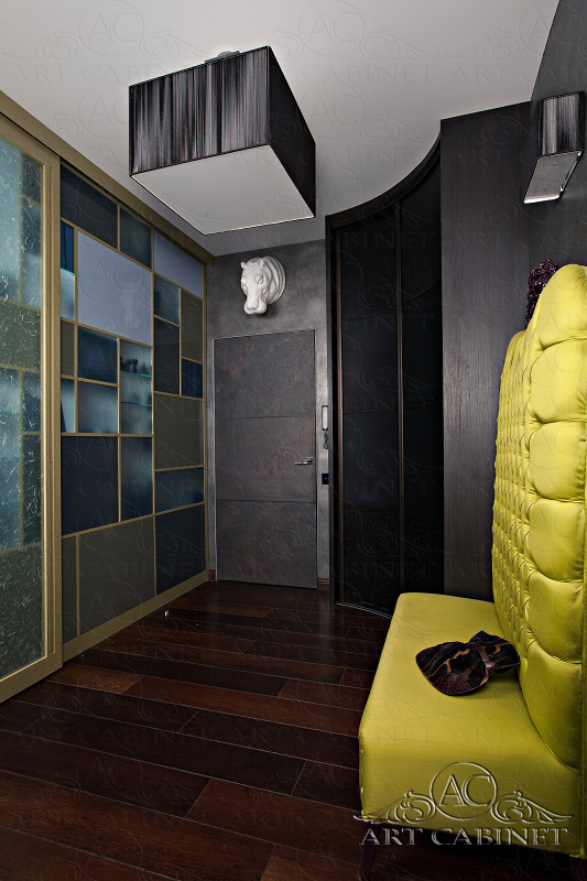 «Нет стереотипам!» — так можно было бы сформулировать девиз, под которым проектировался этот интерьер. Одна из самых интересных разработок- двусторонняя конструкция, разделяющая гостиную и прихожую: со стороны салона она работает как стеллаж для книг и статуэток, со стороны холла- как шкаф для обуви.