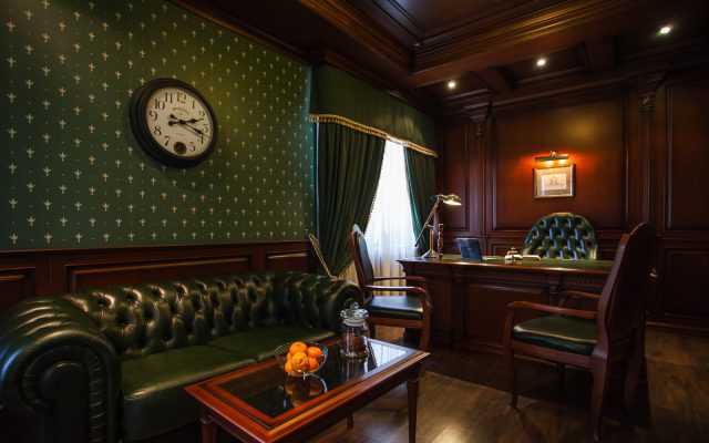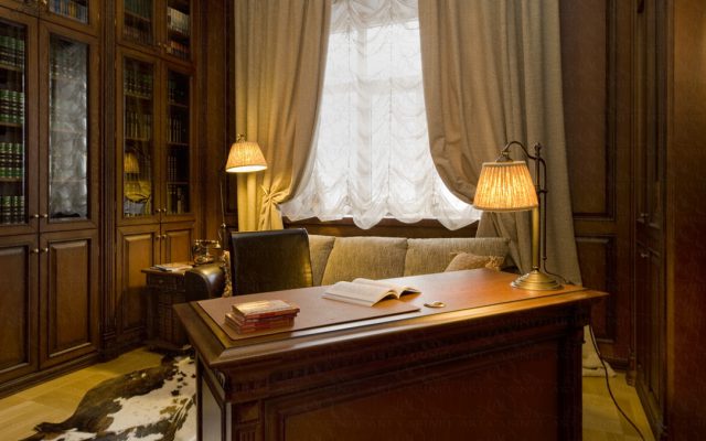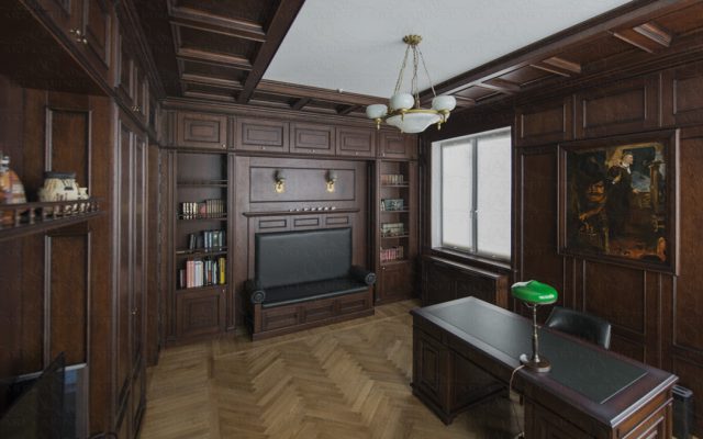 Кабинет в стиле «Сталинского ампира» популярного в 40х-50х годах прошлого века. Сталинский диван, массивный стол с кожаной столешницей, классическая библиотека.