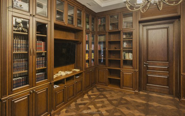 Приоритетным направлением деятельности нашей компании является изготовление кабинетов и библиотек в классическом стиле. Представляем Вам один из наиболее интересных классических кабинетов для помещений небольшой площади, гармонично сочетающим в себе все элементы, присущие классическим деревянным кабинетам: массивный кабинетный стол, деревянные стеновые панели, строгие классические библиотечные шкафы, место для отдыха. Все, что необходимо хозяину кабинета для комфортной работы в тишине собственного загородного дома.