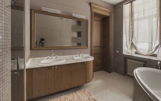 Эксклюзивная мебель для ванных комнат с использованием радиусных элементов. Ничего лишнего, строгая классика.
