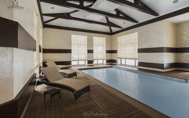 При деревянной отделке интерьера бассейна нами были использованы декоративные потолочные балки и продольные стеновые панели цвета «венге», контрастно сочетающиеся с тиковым паркетом рекреационной зоны. Компактный кухонный гарнитур SPA зоны выполнен из американского ореха без дополнительного тонирования. Естественная красота этого дерева, его экологичность и отличные эксплуатационные качества великолепно вписываются в общую концепцию этого загородного-домашнего места активного отдыха.