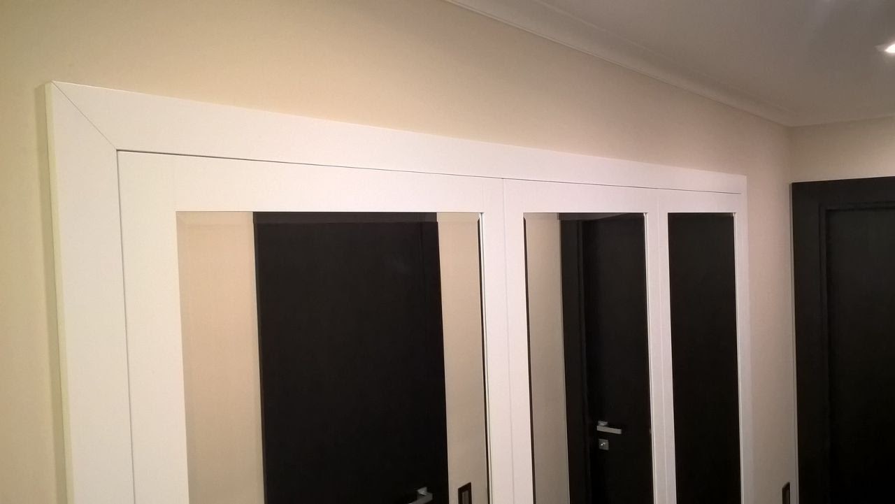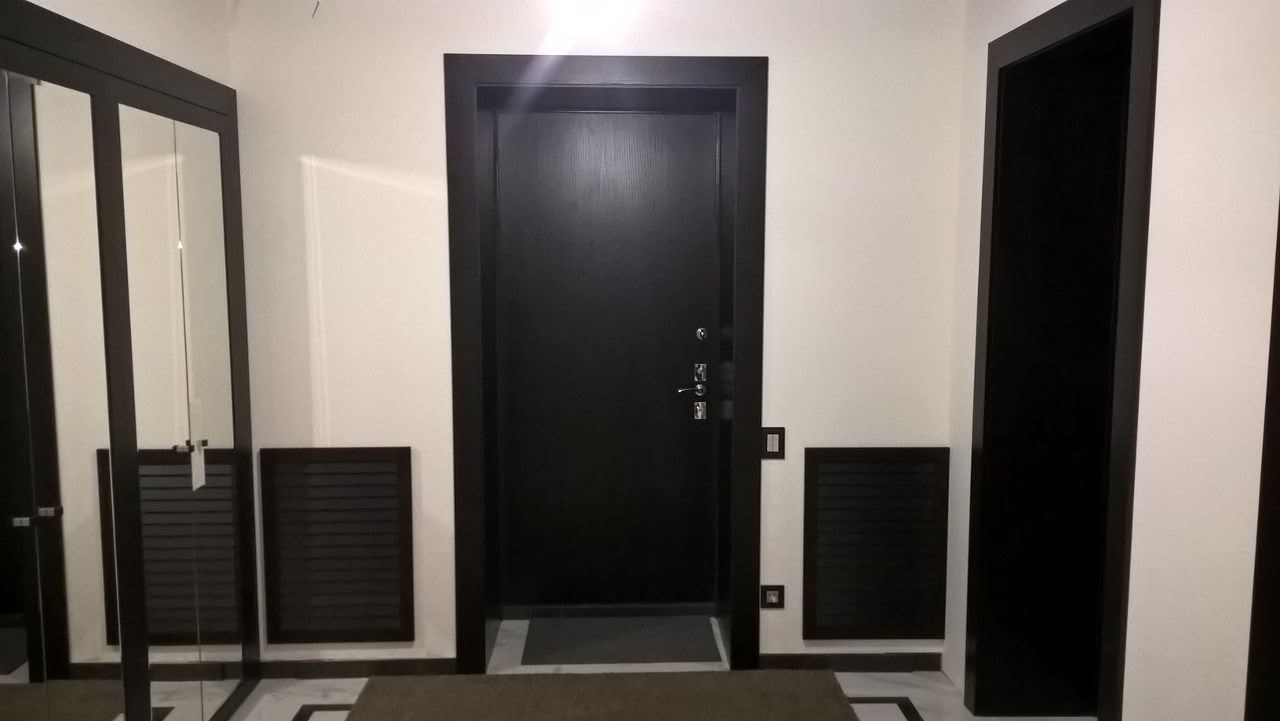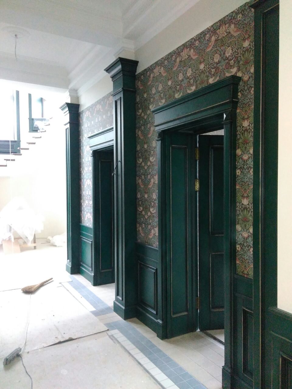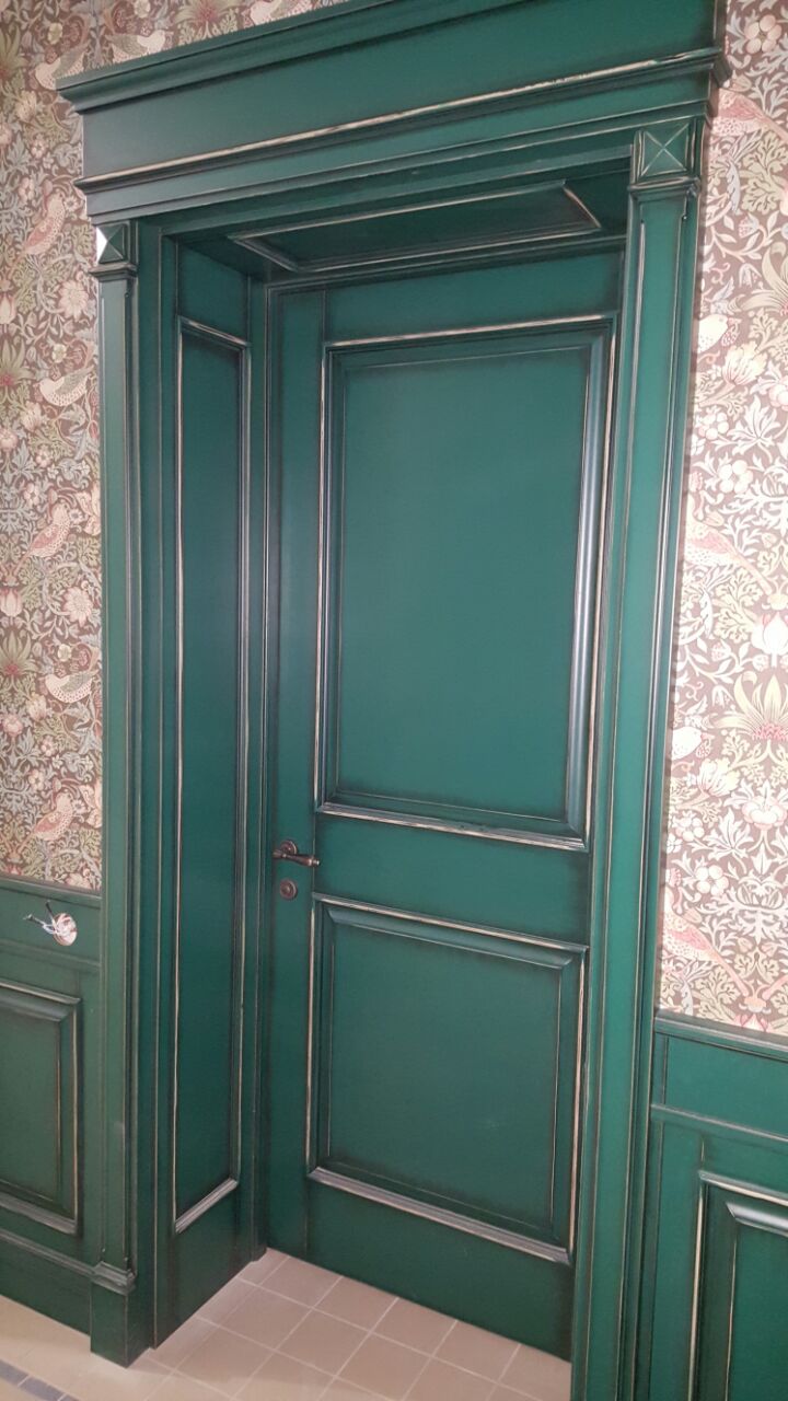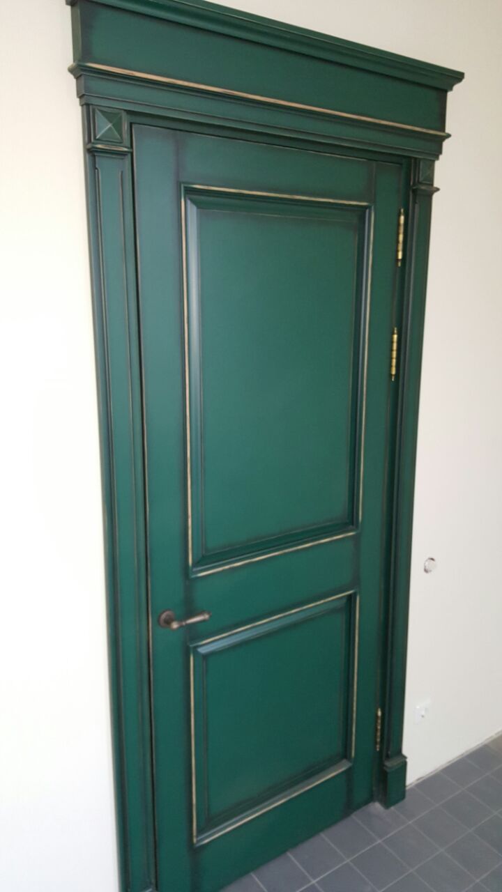 На многих наших объектах дверные блоки монтируются в дверные проемы с очень значительной толщиной стен. Несколько примеров классического оформления таких дверных проемов с массивными филенчатыми дверями, широкими доборами, карнизом, канелюрами на пилястрах в наших работах: