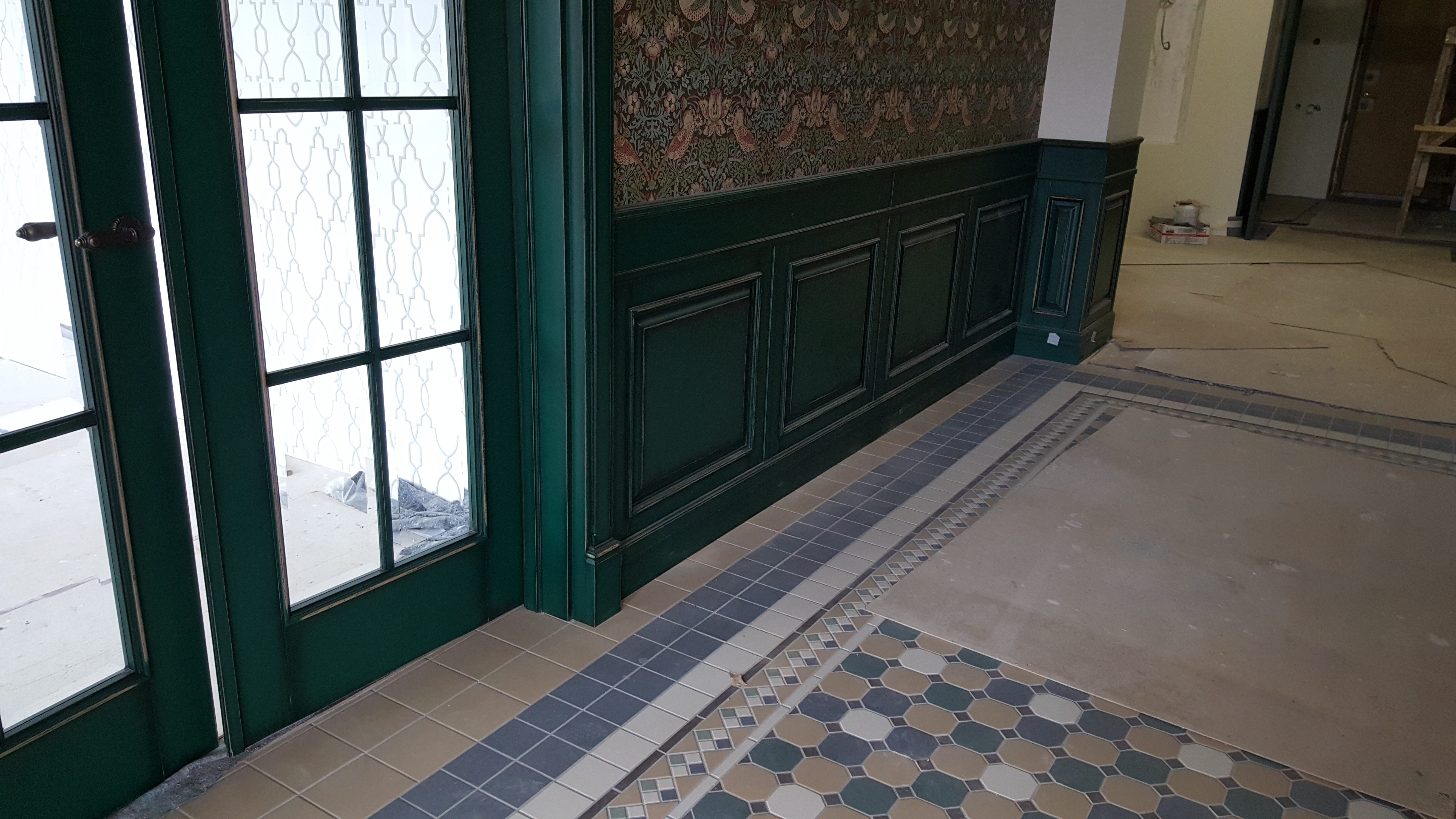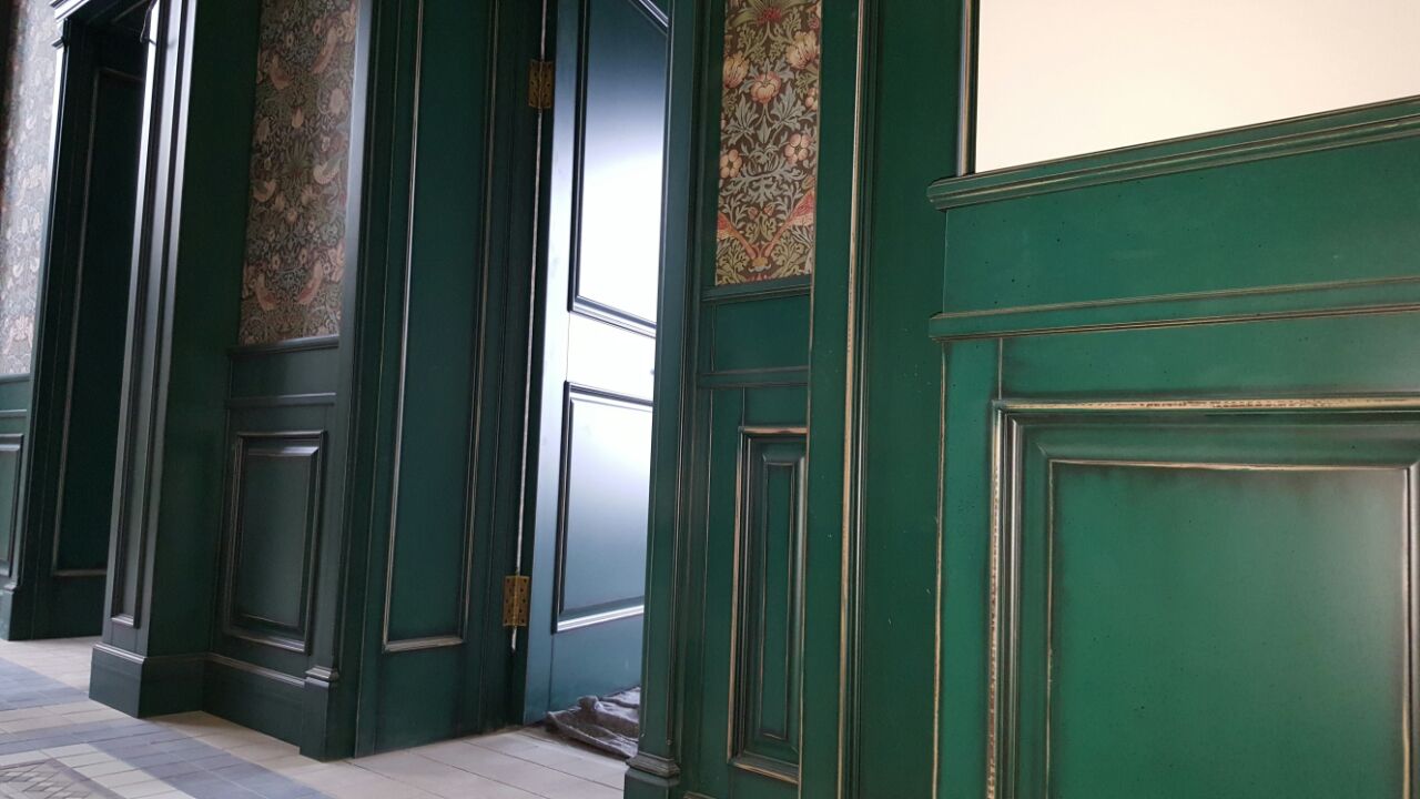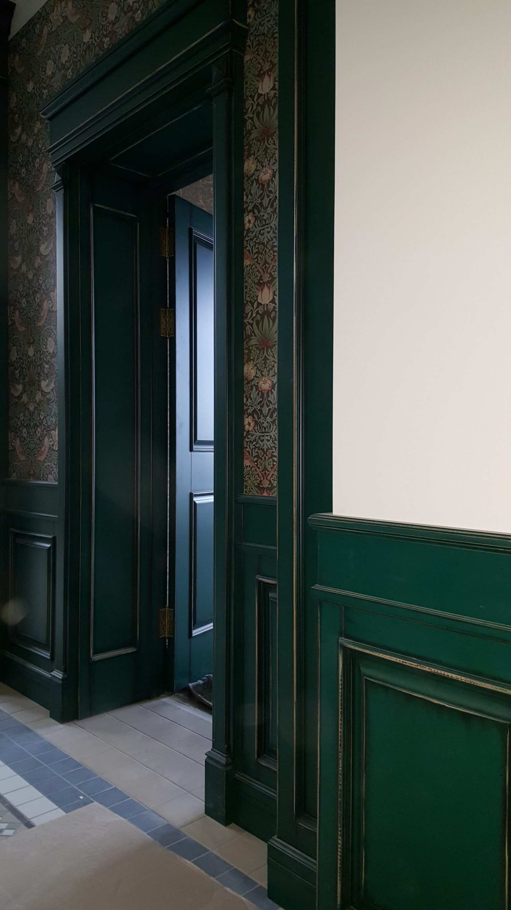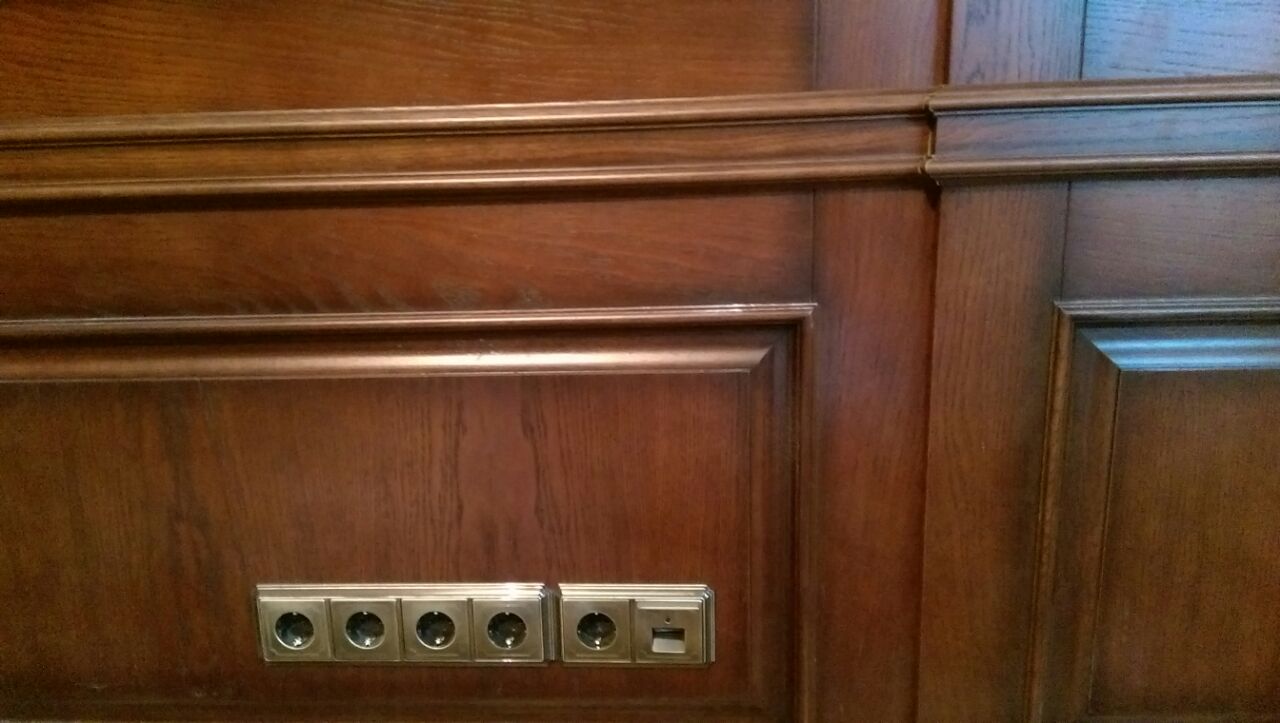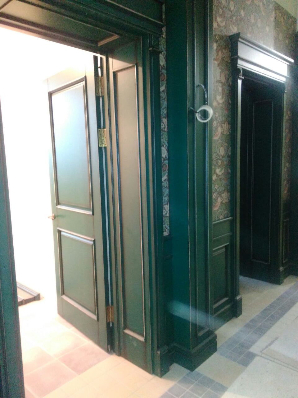 На многих наших объектах дверные блоки монтируются в дверные проемы с очень значительной толщиной стен. Несколько примеров классического оформления таких дверных проемов с массивными филенчатыми дверями, широкими доборами, карнизом, канелюрами на пилястрах в наших работах:
