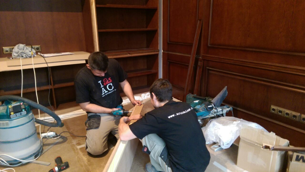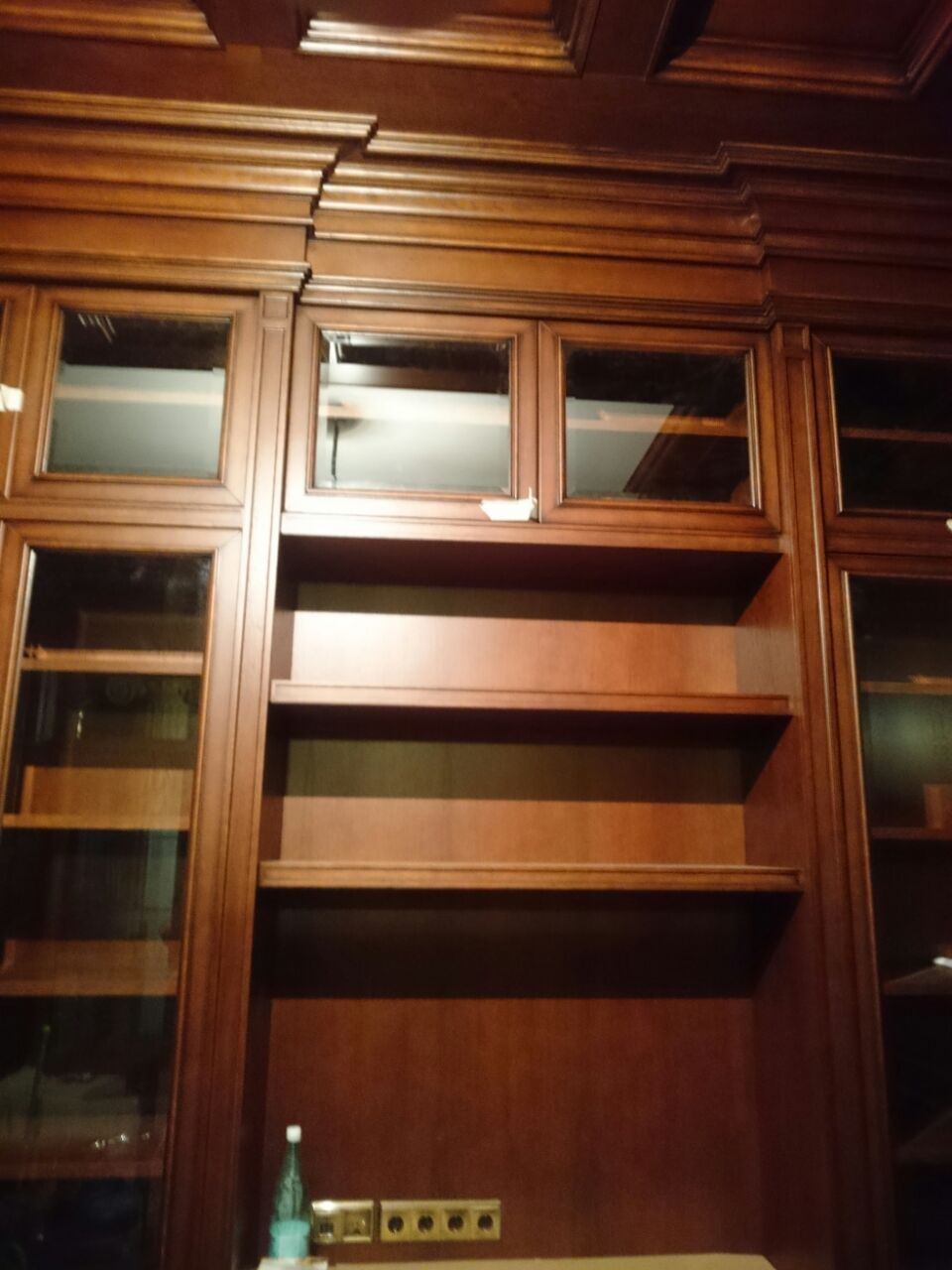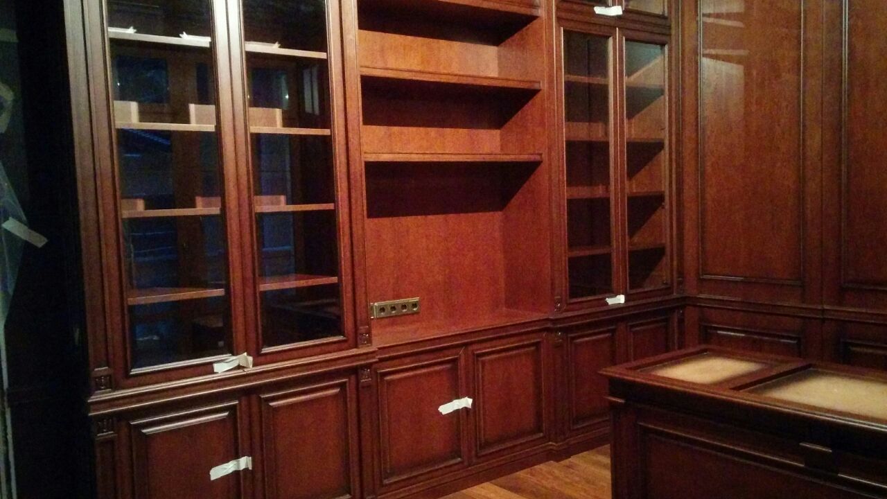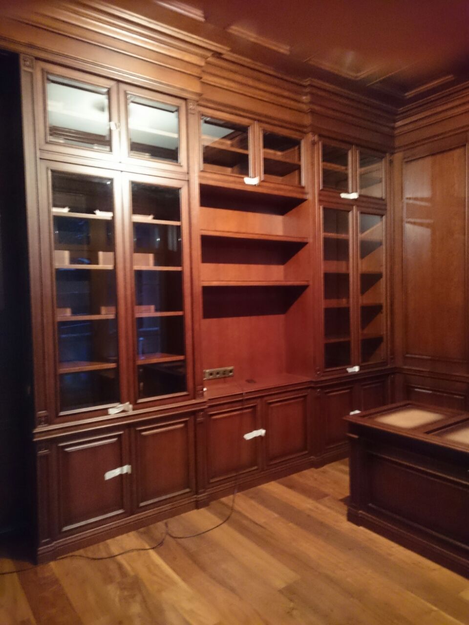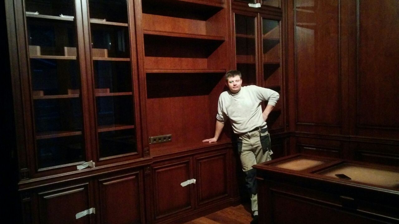 Рабочие фото монтажа большого домашнего кабинета-библиотеки.