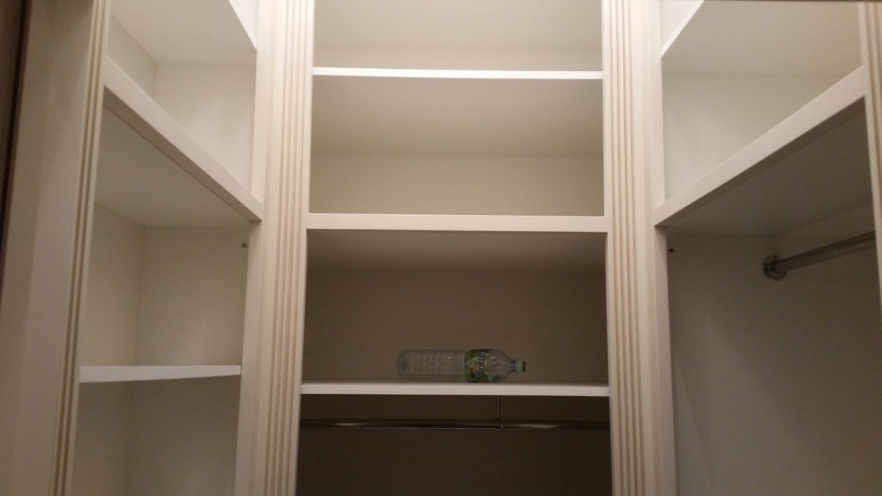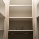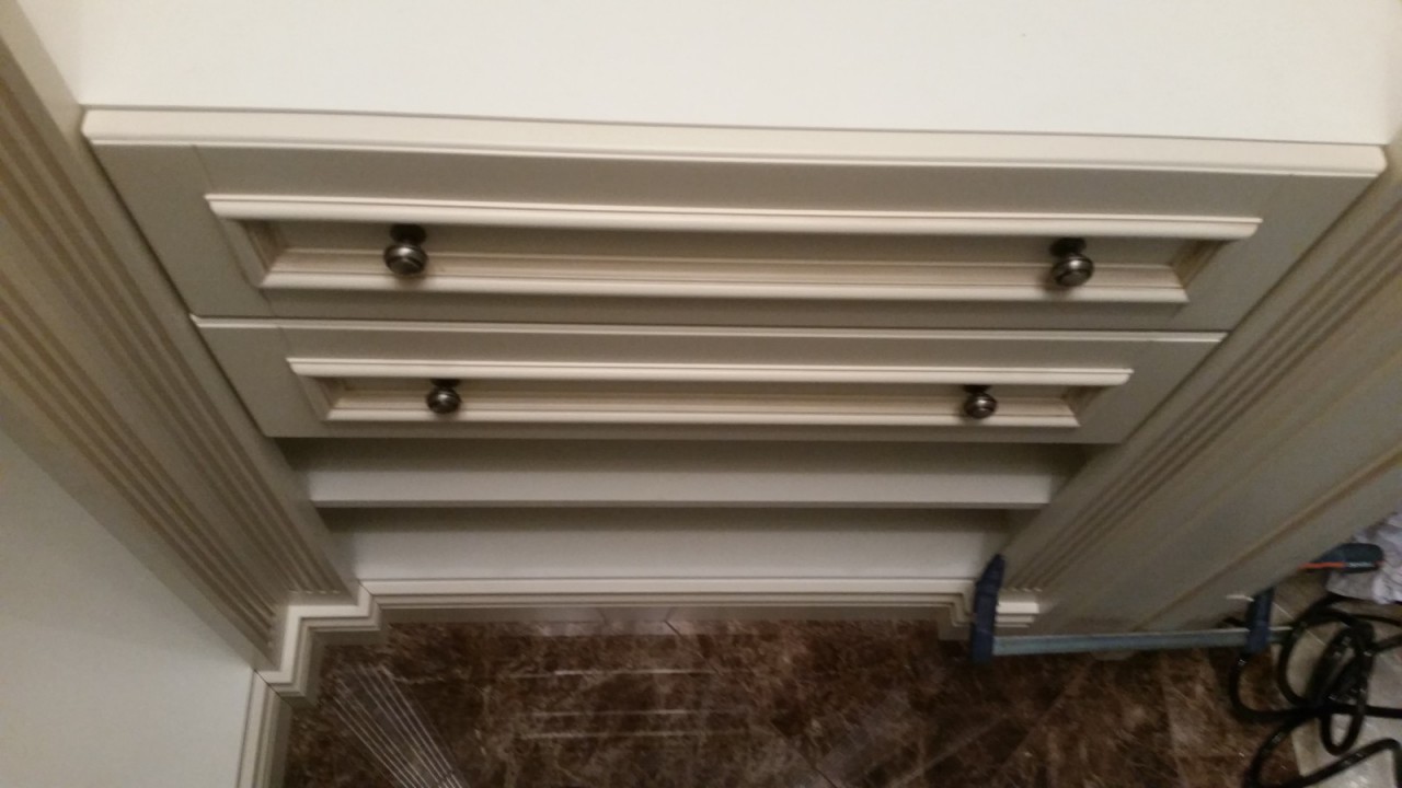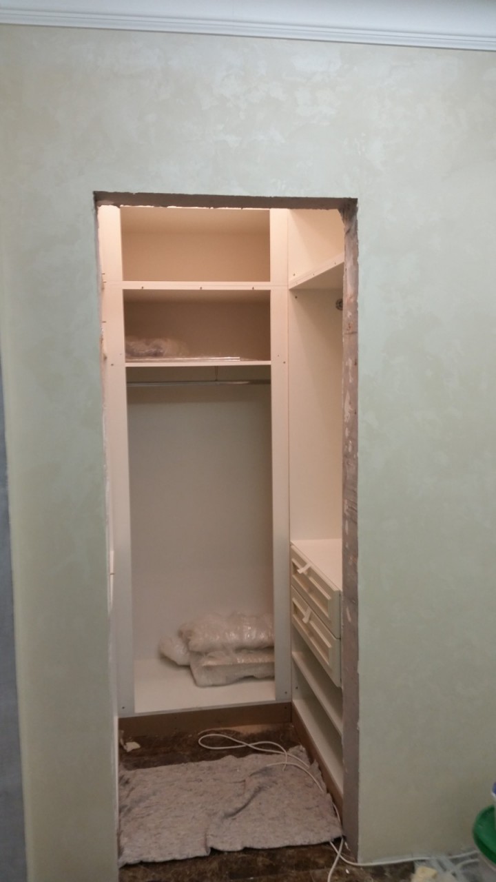 Шкаф в спальне. Финальная стадия монтажа. Дверцы шкафа-купе с филенками и резьбой прикрывают и открытые полки и выдвижные ящики.