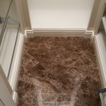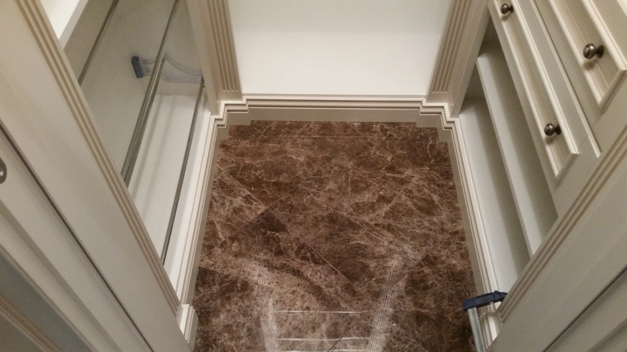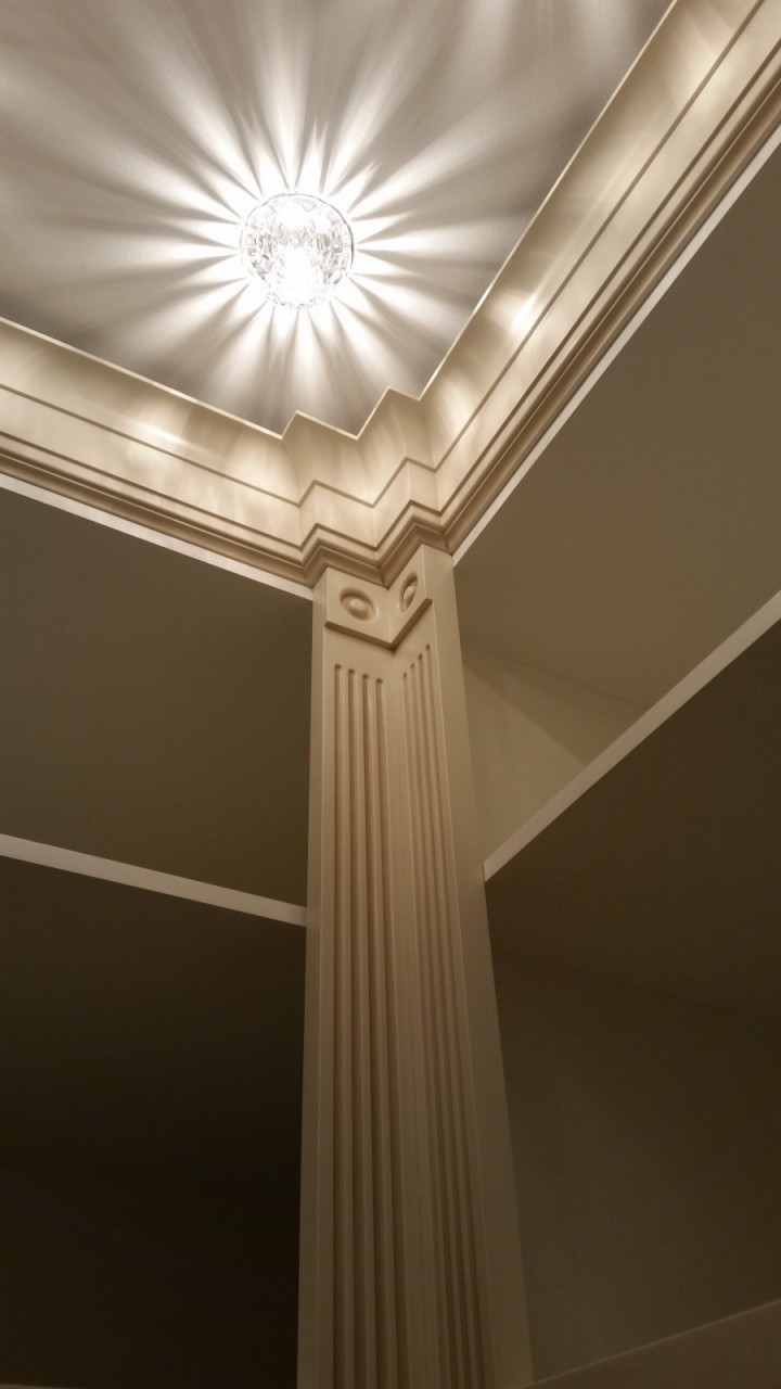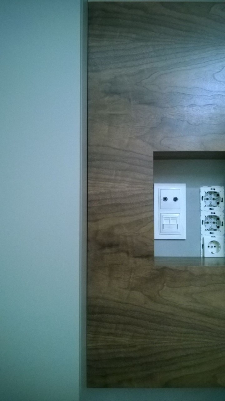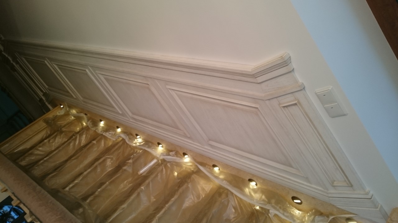 Смонтировали большое зеркало в прихожей и установили шкаф со стеллажами. Обрамление зеркала, накладка на металлическую дверь, дверные блоки и порталы, плинтуса, пилястры (т.е. все столярные изделия на этом объекте) изготовлены на нашем производстве.