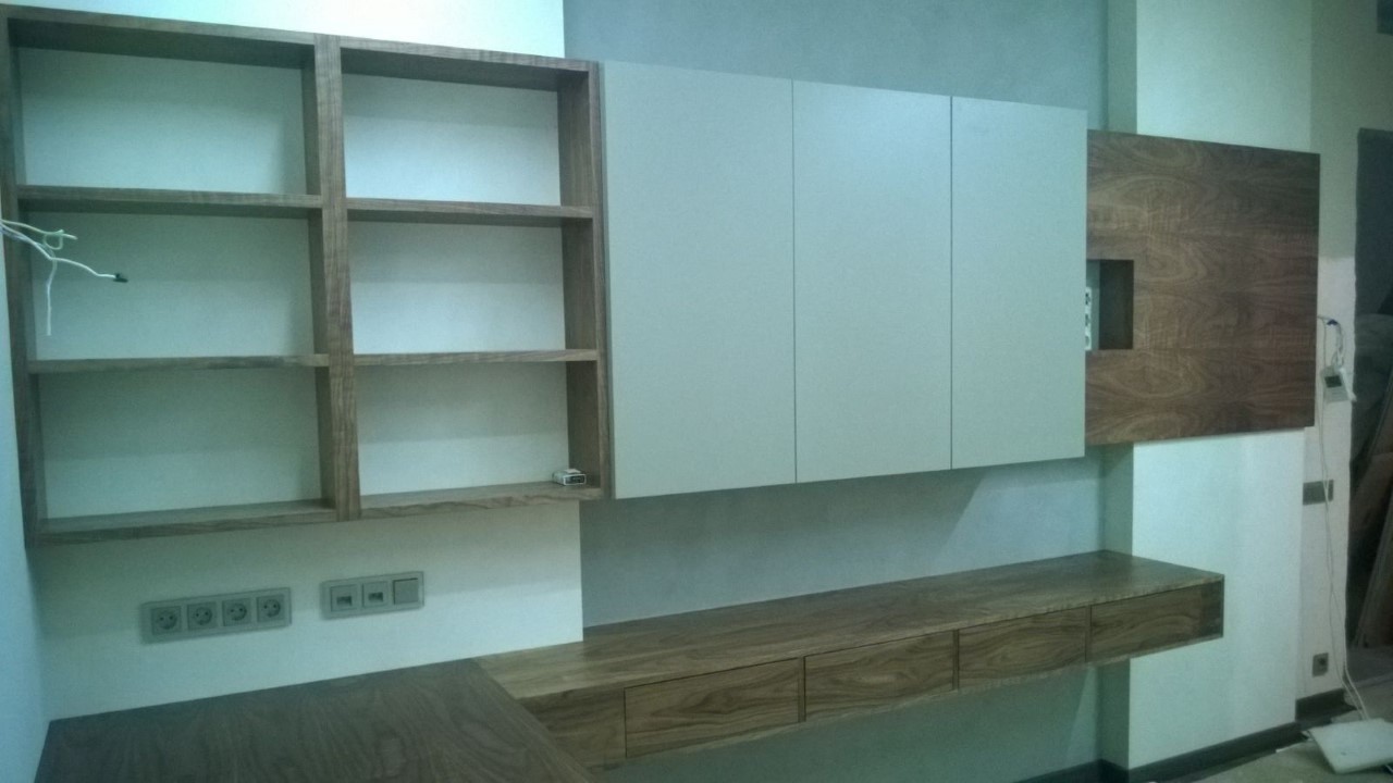Фото из рубрики «как было и как стало». Предварительная сборка кабинетного шкафа из ореха перед его сдачей в отделку и этот же шкаф в интерьере после сдачи объекта. Весь ореховый кабинет (наши столярные изделия: библиотечный встроенный кабинетный шкаф, книжный стеллаж-портал, письменный стол, отдельно стоящий шкаф) можно посмотреть здесь.