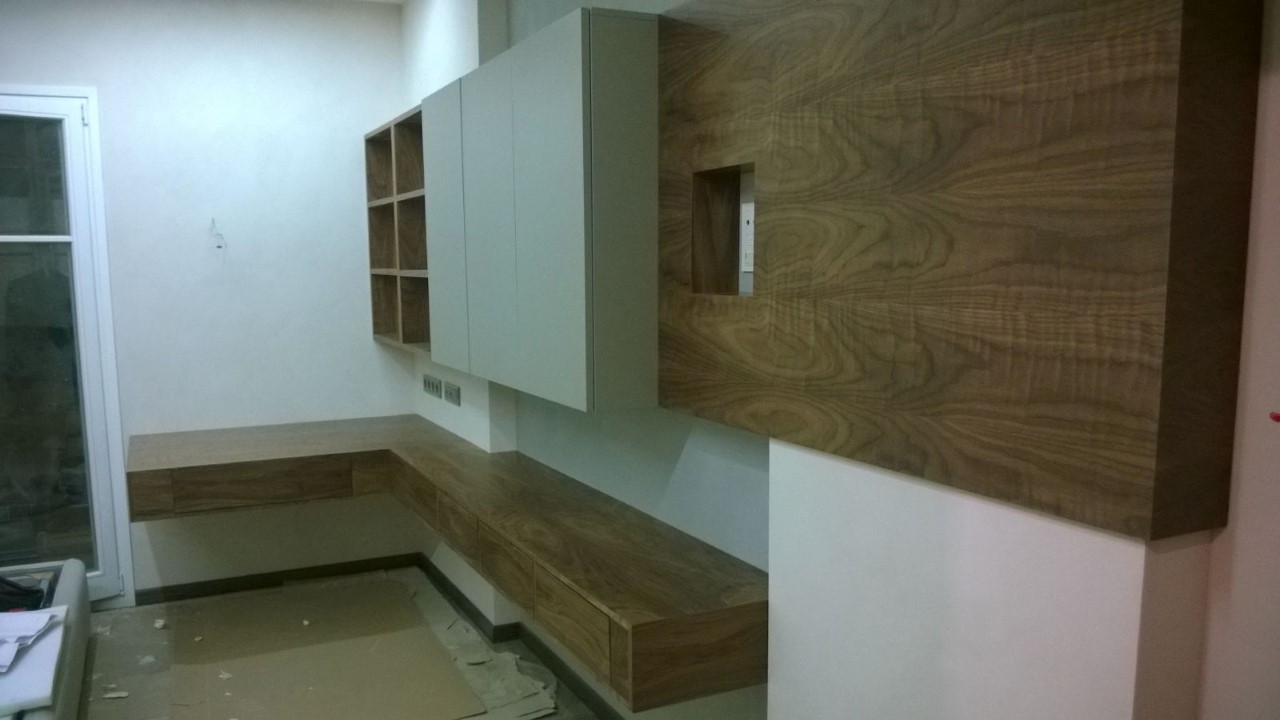 Свободно висящая столешница из ореха с интегрированными ящиками позволяет без проблем организовать удобное рабочее пространство. Вместительные ящики полного выдвижения практически невидимы, но позволяют вместить огромное количество разной мелочевки.