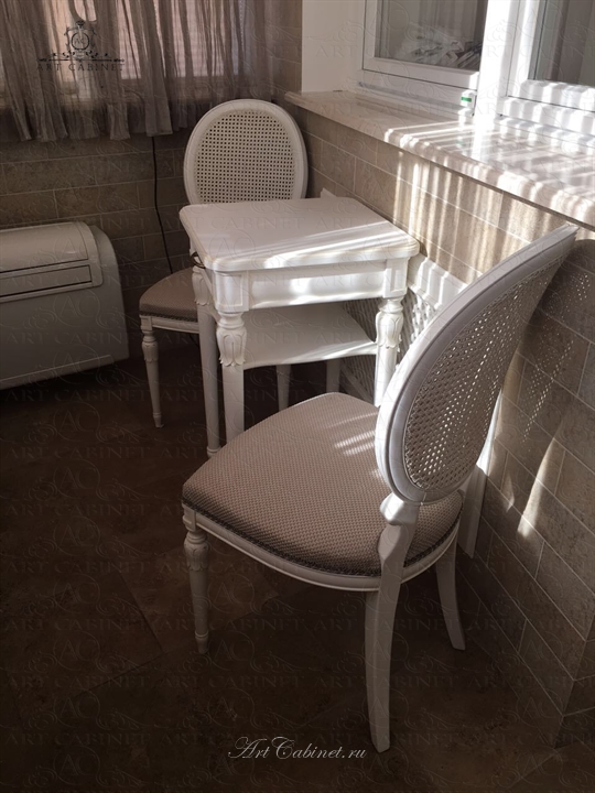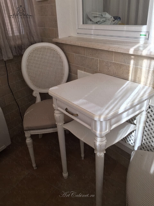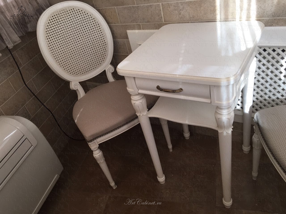 Этот кофейный столик был выполнен в стиле уже имевшихся у нашего заказчика стульев. Копирование и массштабирование резных элементов ножек, соблюдение пропорций и наш, авторский, дизайн самого кофейного столика позволили идеально вписать его в имеющийся гарнитур и сделать его украшением интерьера балкона.