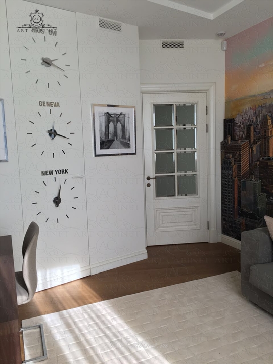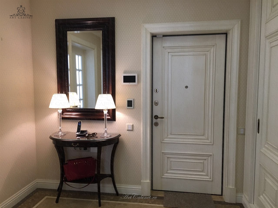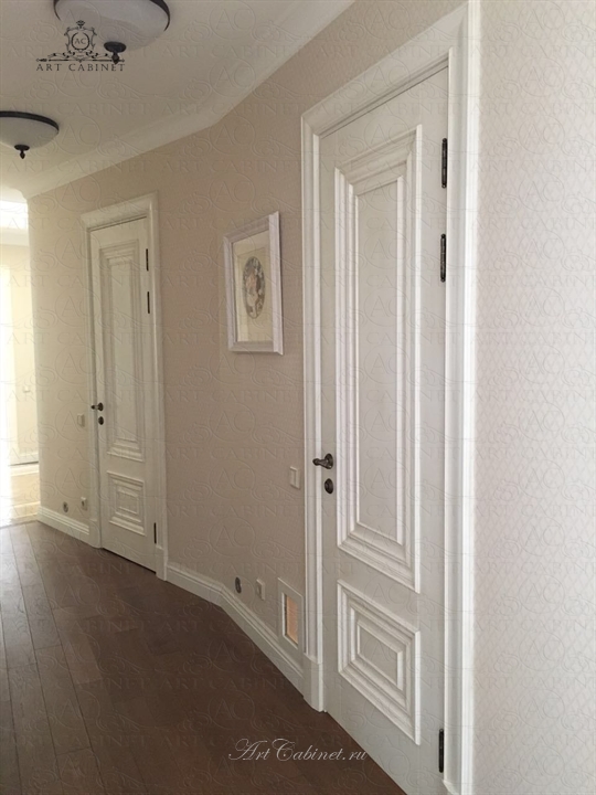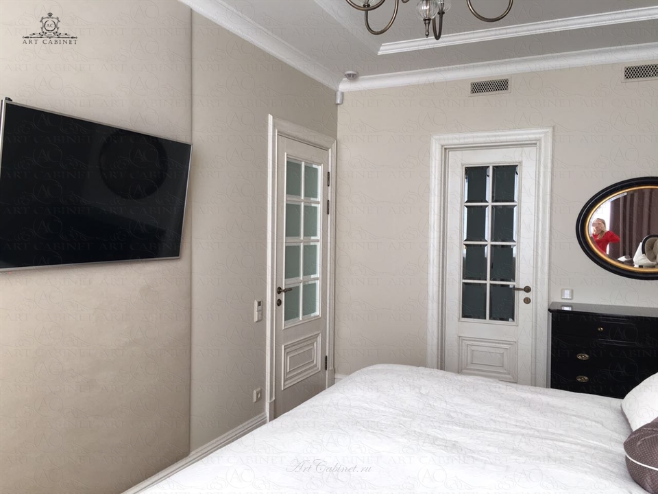 Межкомнатные двери, дверная накладка на металлическую входную дверь, раздвижные двери гардеробной, дверные порталы и дверные группы, наличники и плинтуса в едином стиле объединяют пространство квартиры и задают основной тон всему интерьеру.