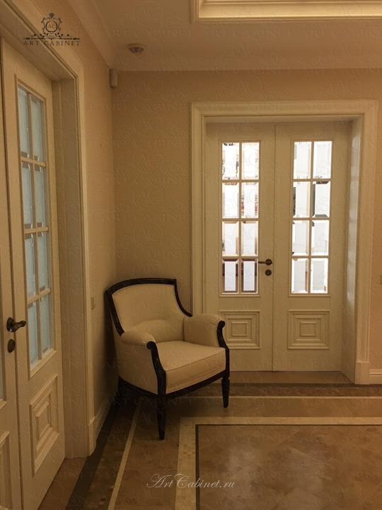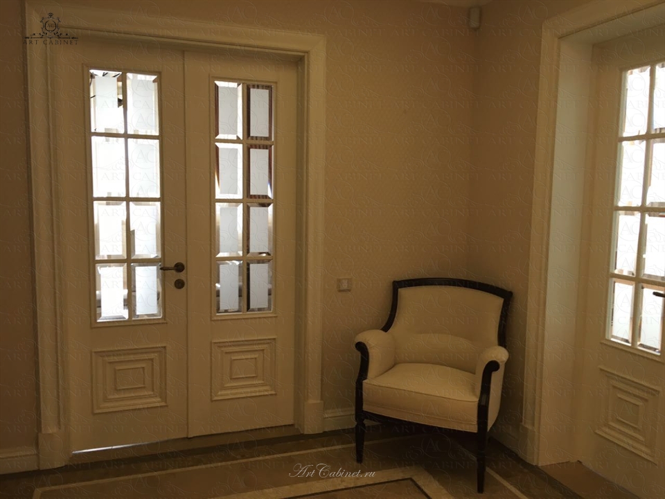 Очень гармонично смотрятся в этих классических межкомнатных дверях матовые стекла с широким двусторонним прозрачным фацетом.