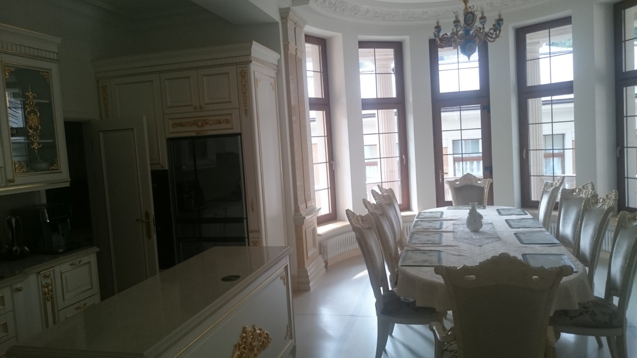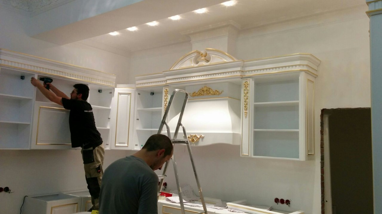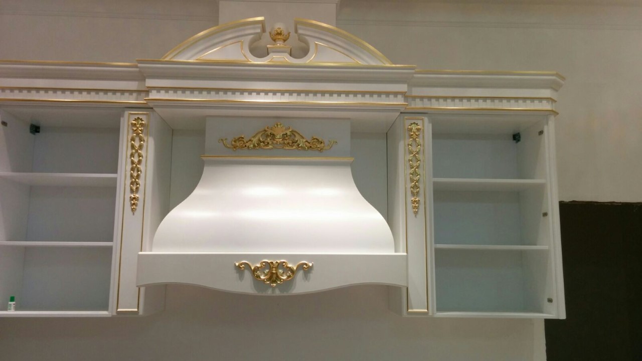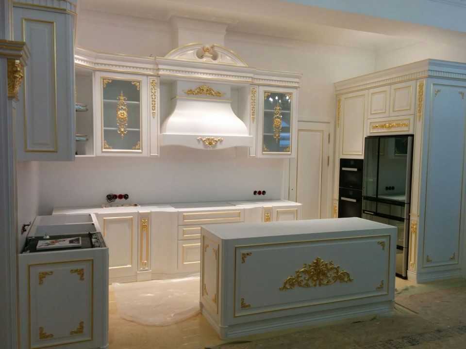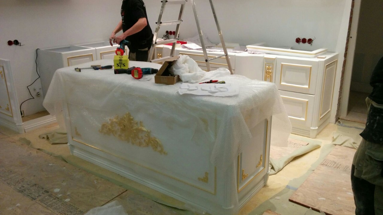 «Парадная» кухня в загородном особняке. Белоснежная, декорированная резьбой и сусальным золотом, с отдельностоящим островом и интегрированной техникой. Это надо видеть. Фото с монтажа и итоговая «жилая атмосфера».