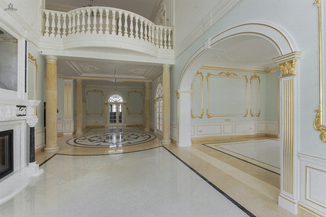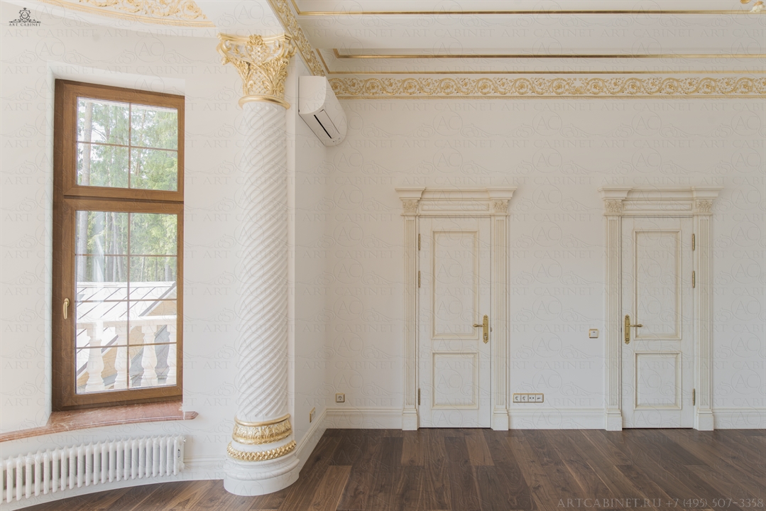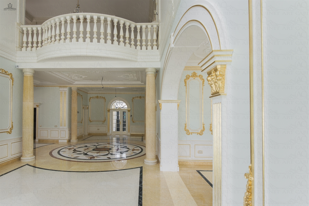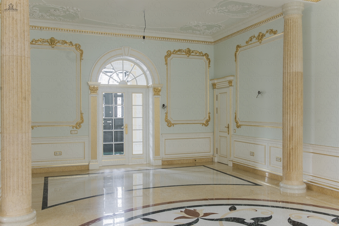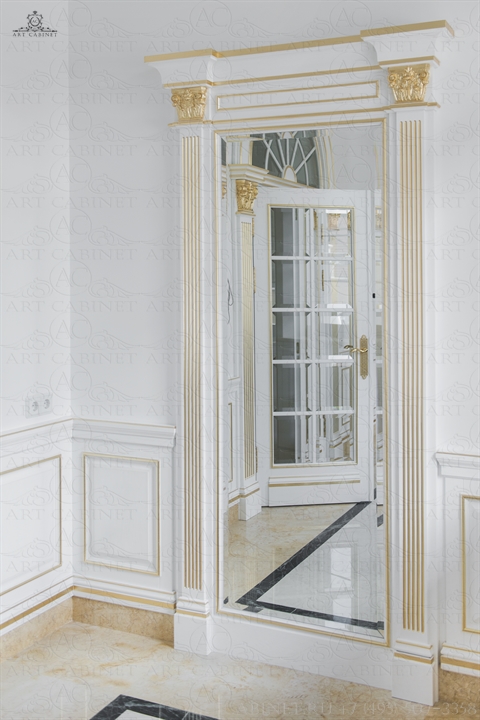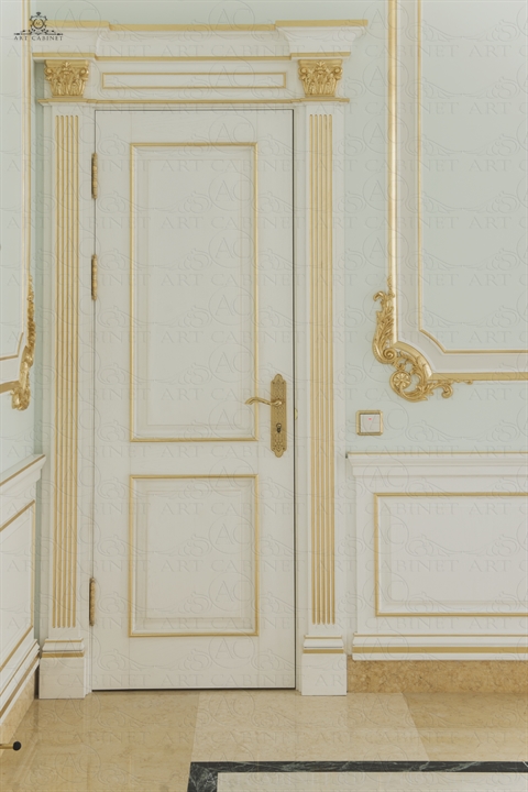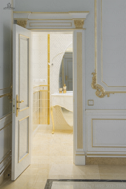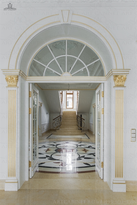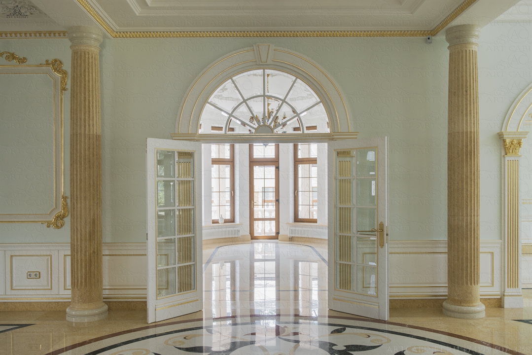 Роскошный интерьер элитного особняка выполнен в классическом стиле. Отделка декоративных элементов сусальным золотом, использование стеклянных элементов с широким двусторонним фацетом позволили добиться воздушного, солнечного и яркого интерьера. Это настоящее произведение столярного искусства. Двери, порталы, стеновые панели, резьба и декоративные элементы  выполнены с соблюдением высочайших стандартов качества, предъявляемых к столярным изделиям, выпускаемым на нашем предприятии.