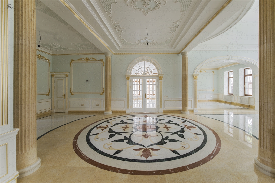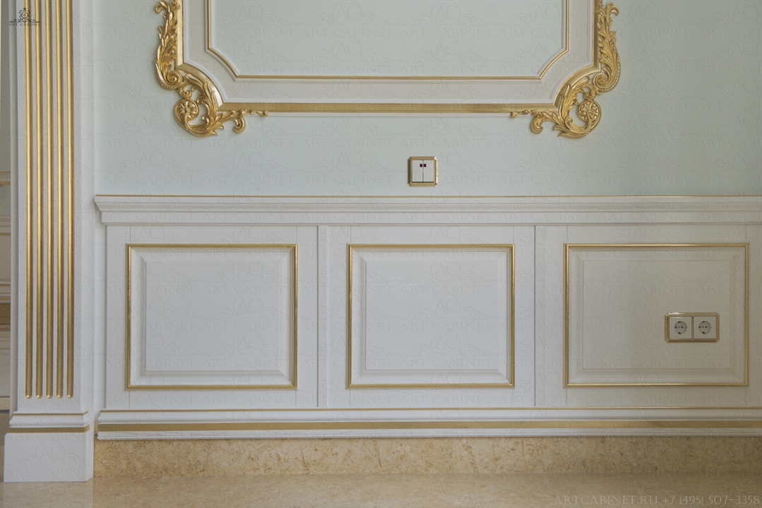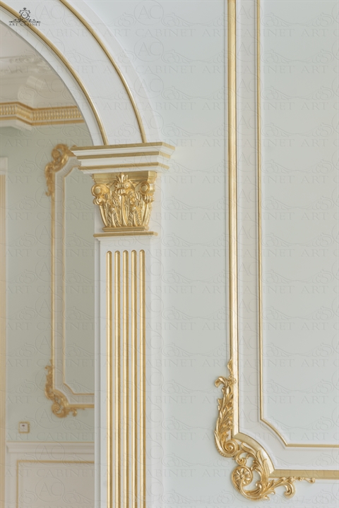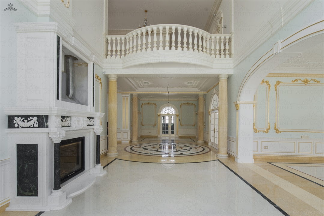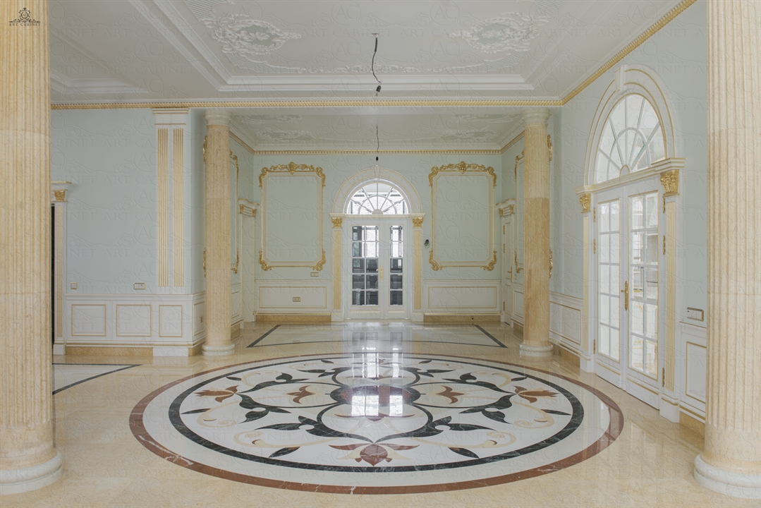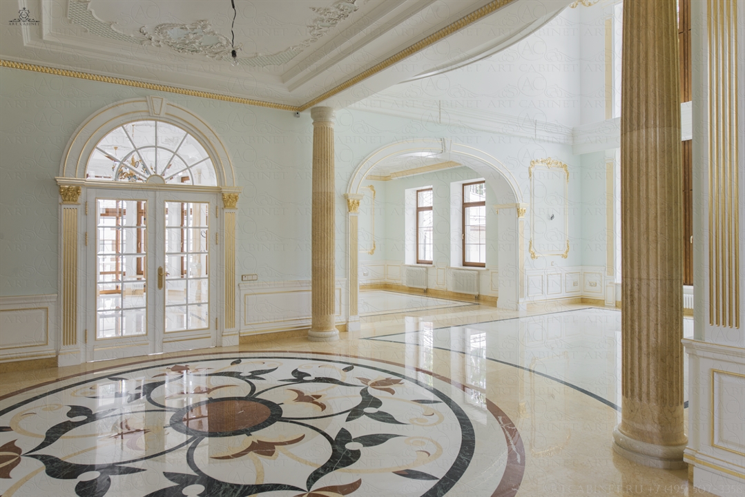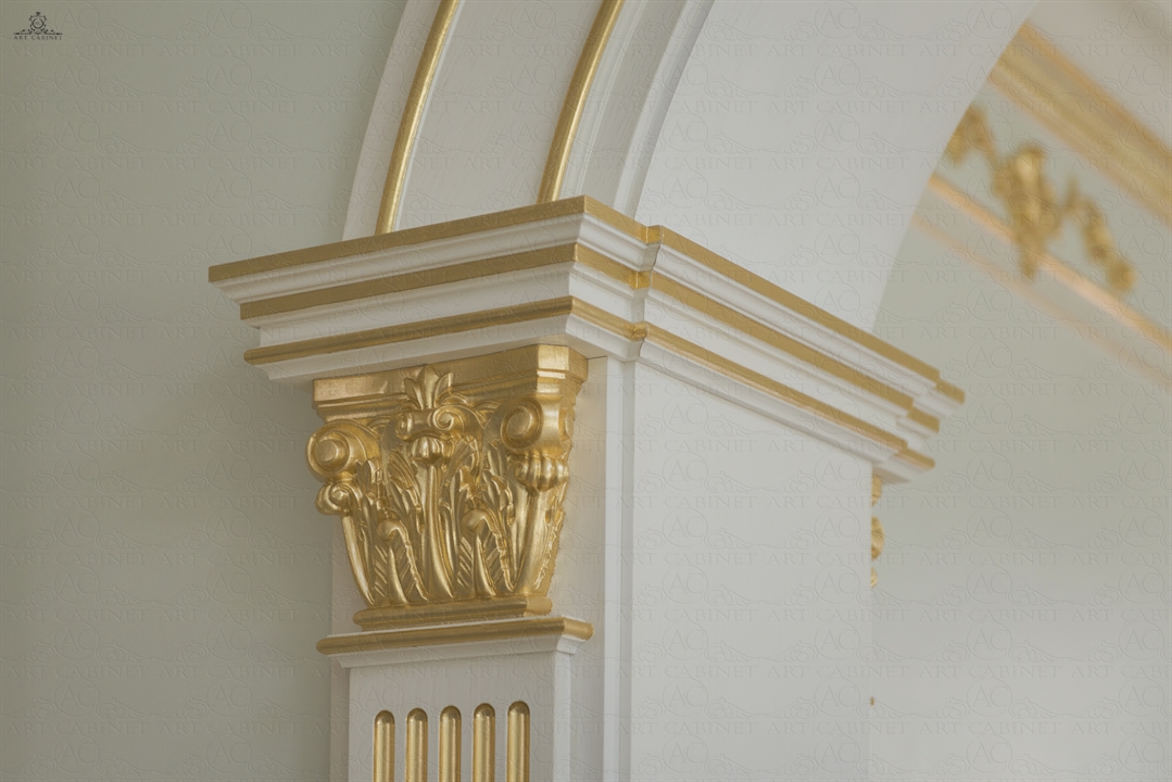 Роскошный интерьер элитного особняка выполнен в классическом стиле. Отделка декоративных элементов сусальным золотом, использование стеклянных элементов с широким двусторонним фацетом позволили добиться воздушного, солнечного и яркого интерьера. Это настоящее произведение столярного искусства. Двери, порталы, стеновые панели, резьба и декоративные элементы  выполнены с соблюдением высочайших стандартов качества, предъявляемых к столярным изделиям, выпускаемым на нашем предприятии.
