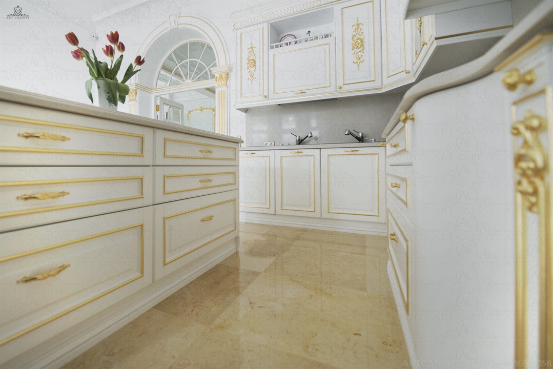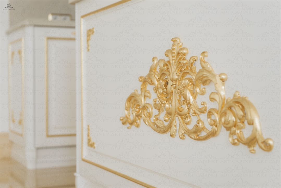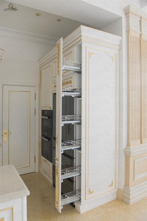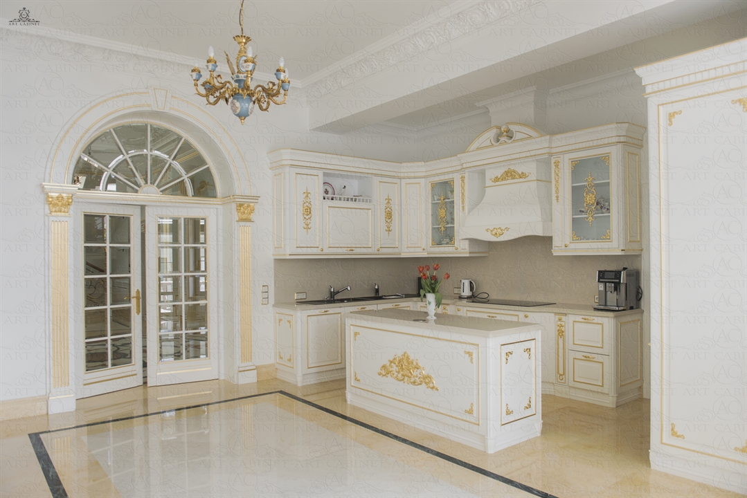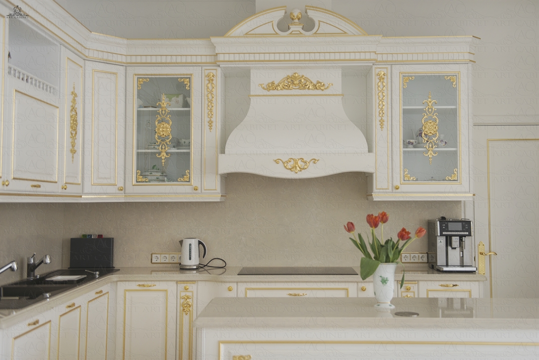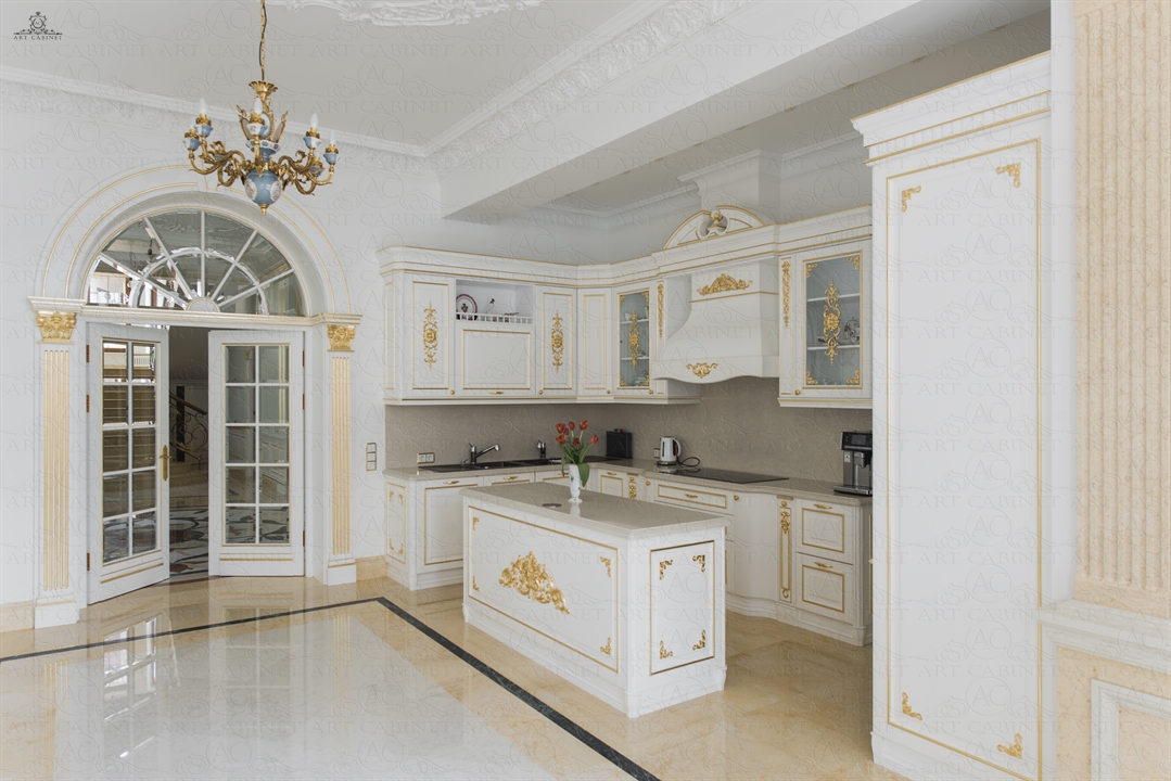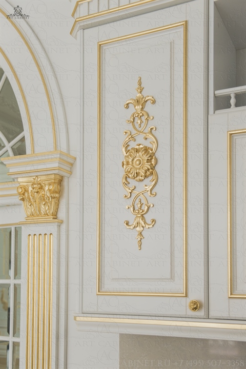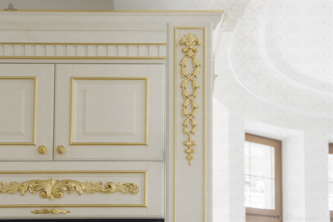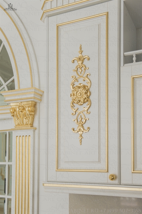 Изысканный классический кухонный ансамбль, выполненный в единой стилистике с остальными столярными изделиями особняка. Сложная, ажурная резьба и декоративная раскладка фасадов вручную покрыты сусальным золотом, использована высококачественная австрийская фурнитура. Кухонные шкафы изначально сконструированы под встраиваемую технику, выбранную заказчиком.