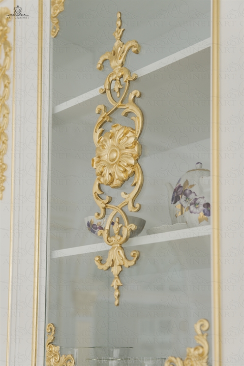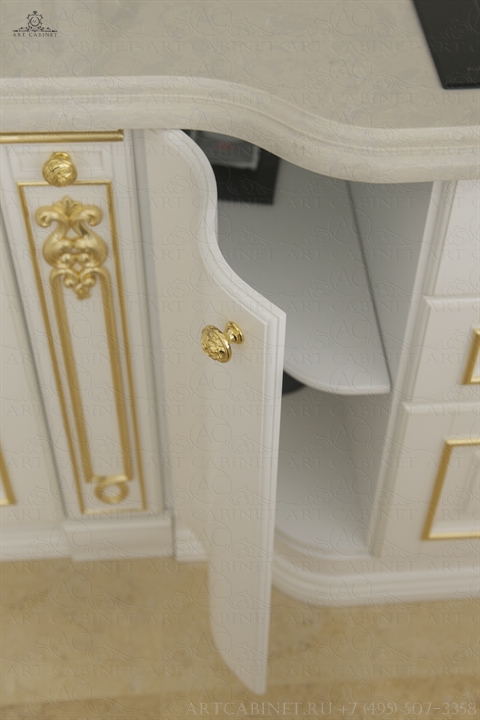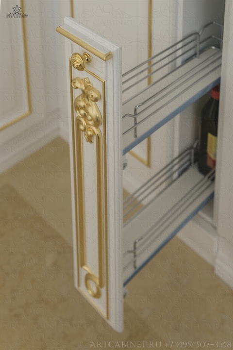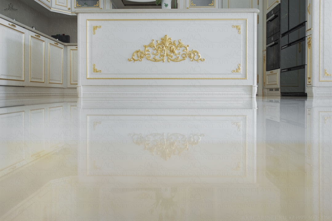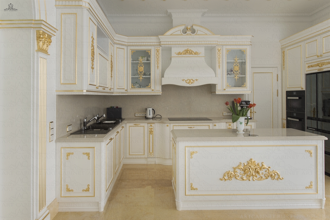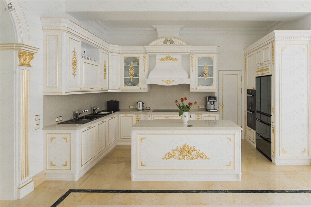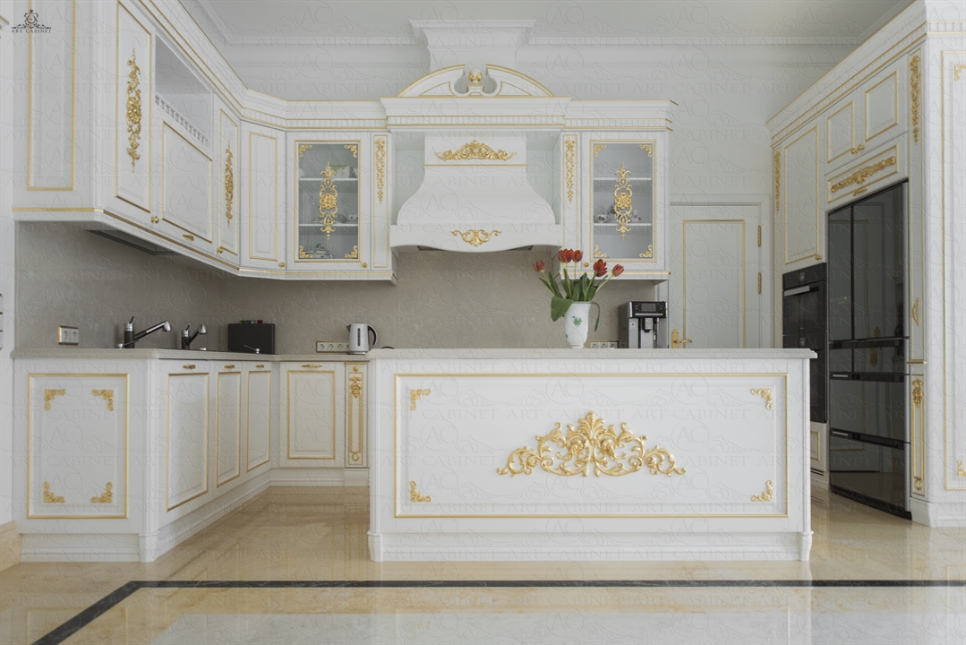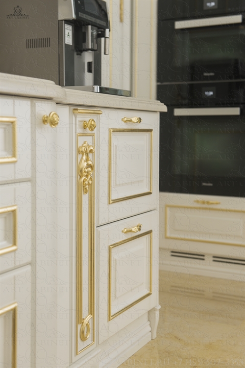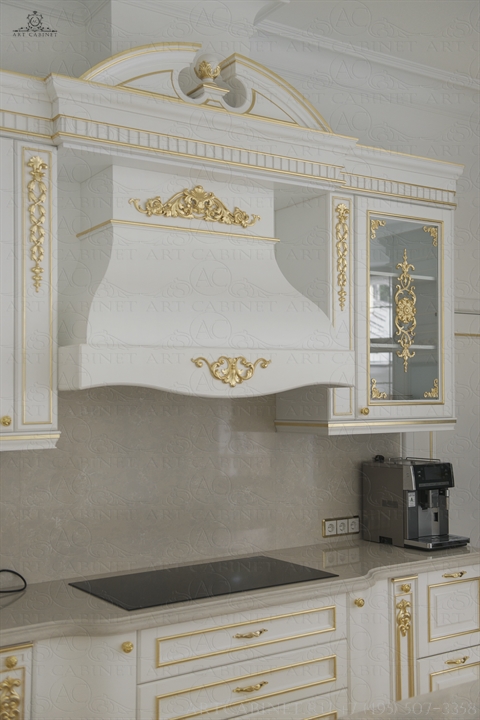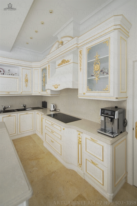 Изысканный классический кухонный ансамбль, выполненный в единой стилистике с остальными столярными изделиями особняка. Сложная, ажурная резьба и декоративная раскладка фасадов вручную покрыты сусальным золотом, использована высококачественная австрийская фурнитура. Кухонные шкафы изначально сконструированы под встраиваемую технику, выбранную заказчиком.