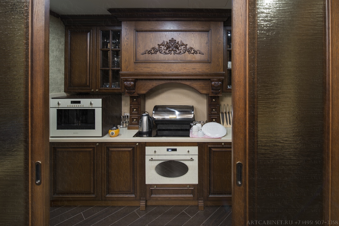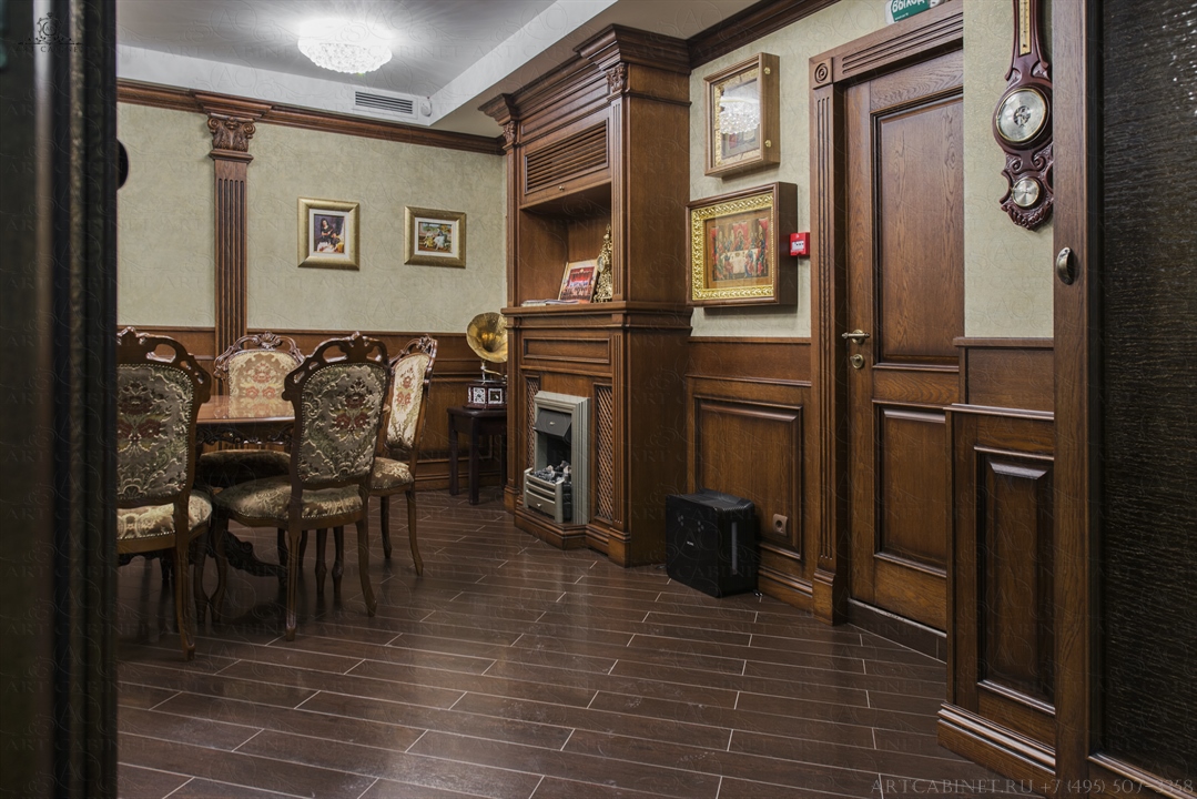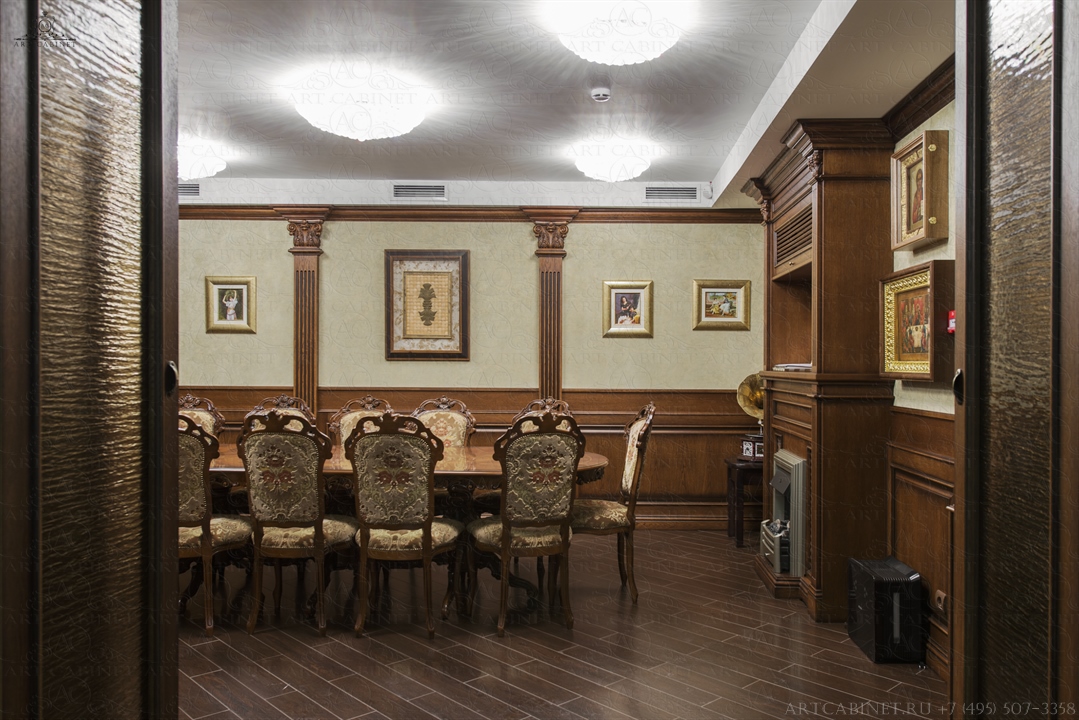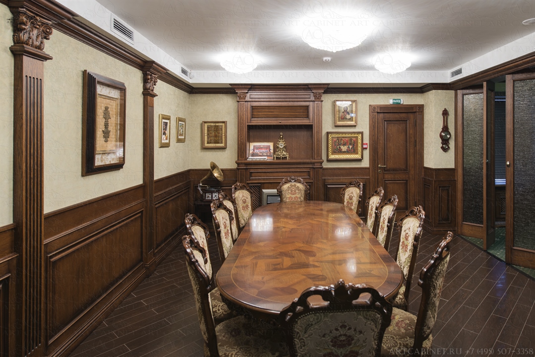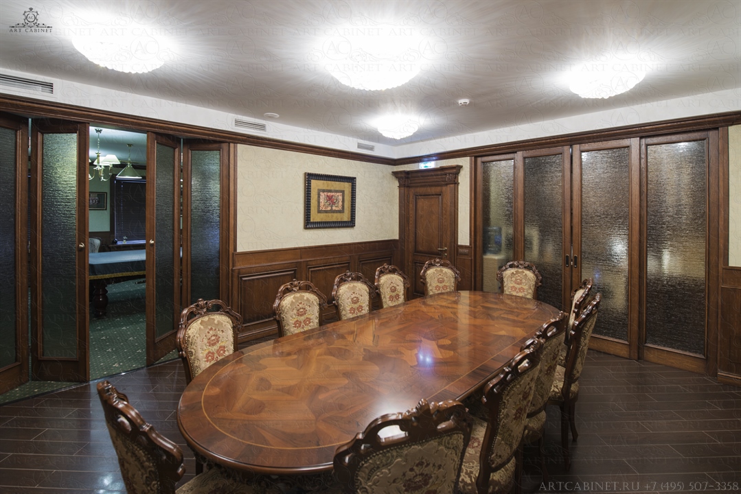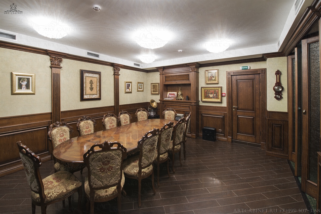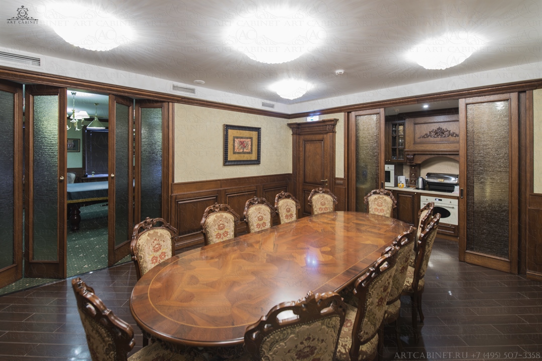 Великолепный классический интерьер помогает настроить участников переговоров на содержательную и обстоятельную беседу, подчеркивает ее важность и значимость. Небольшая, но уютная, кухня за звукоизолированными сдвижными дверями оснащена всем необходимым и позволяет радушно встретить гостей и поддержать их настроение на  длительных деловых встречах.
