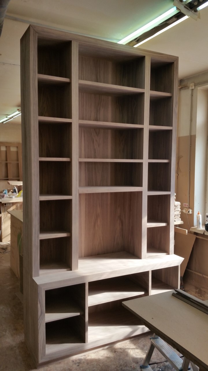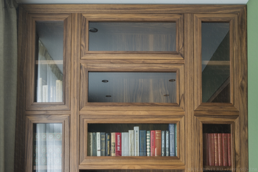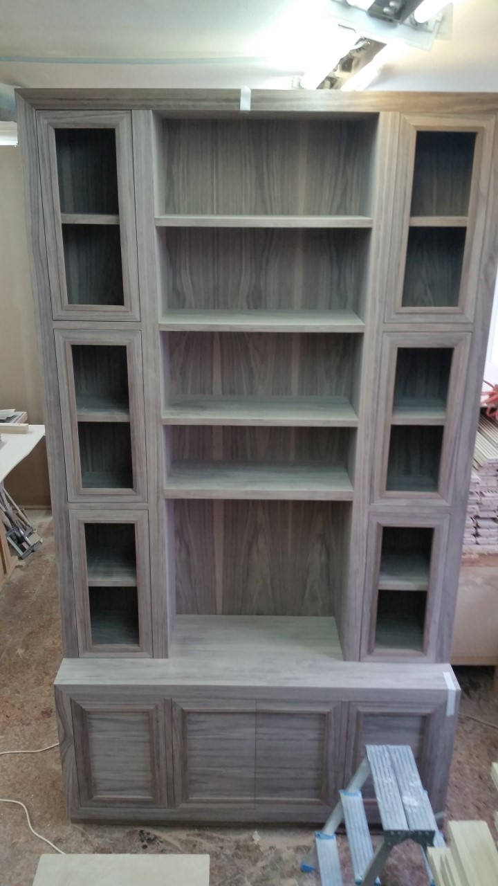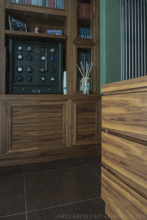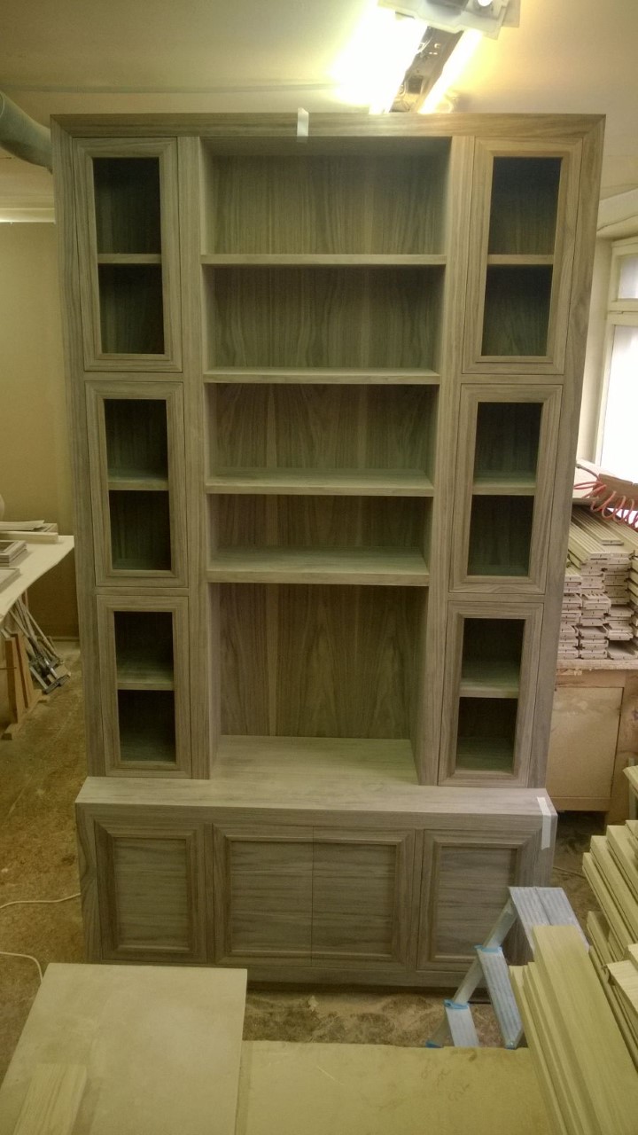 Фото из рубрики «как было и как стало». Предварительная сборка кабинетного шкафа из ореха перед его сдачей в отделку и этот же шкаф в интерьере после сдачи объекта. Весь ореховый кабинет (наши столярные изделия: библиотечный встроенный кабинетный шкаф, книжный стеллаж-портал, письменный стол, отдельно стоящий шкаф) можно посмотреть здесь.