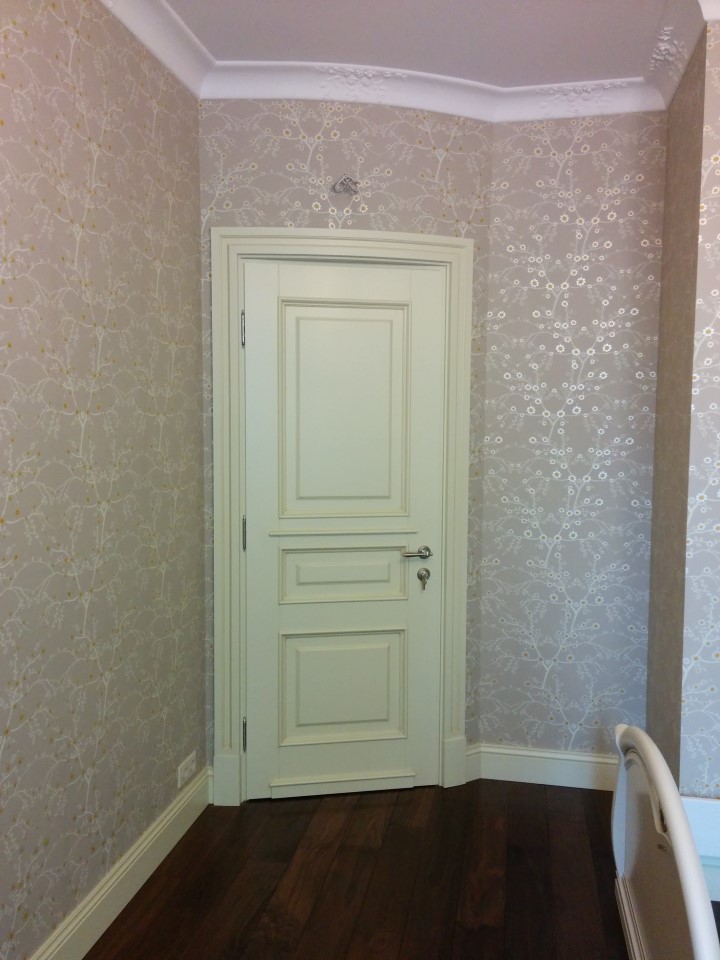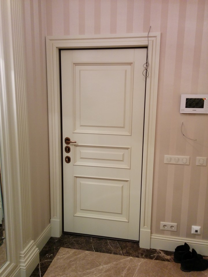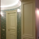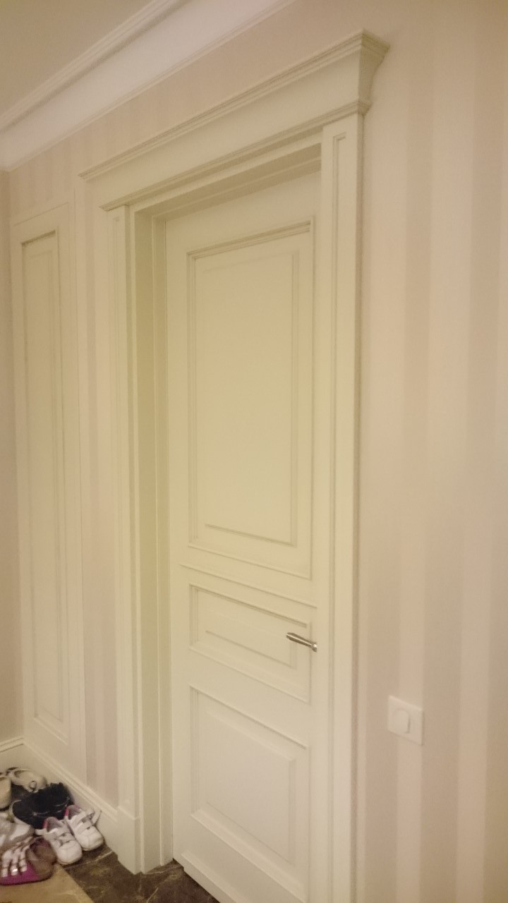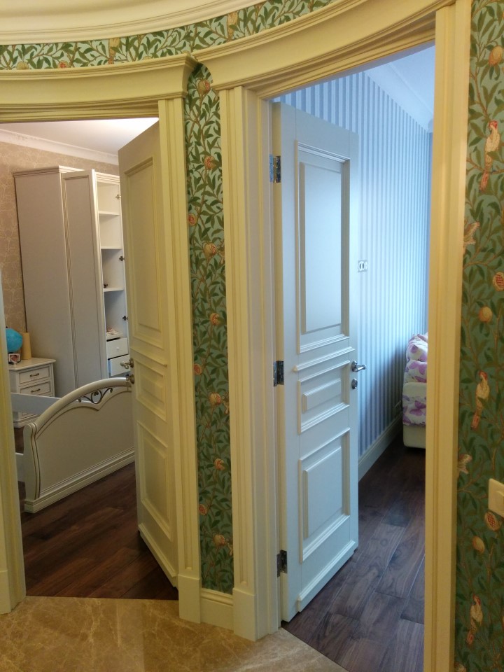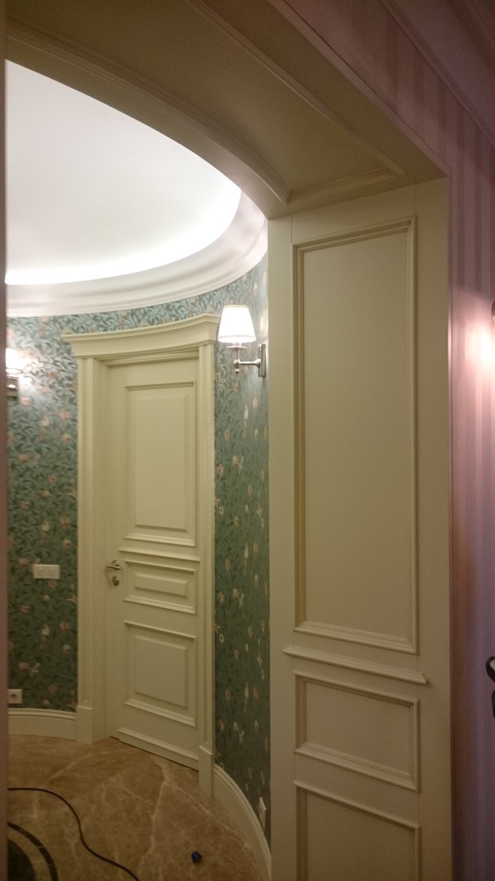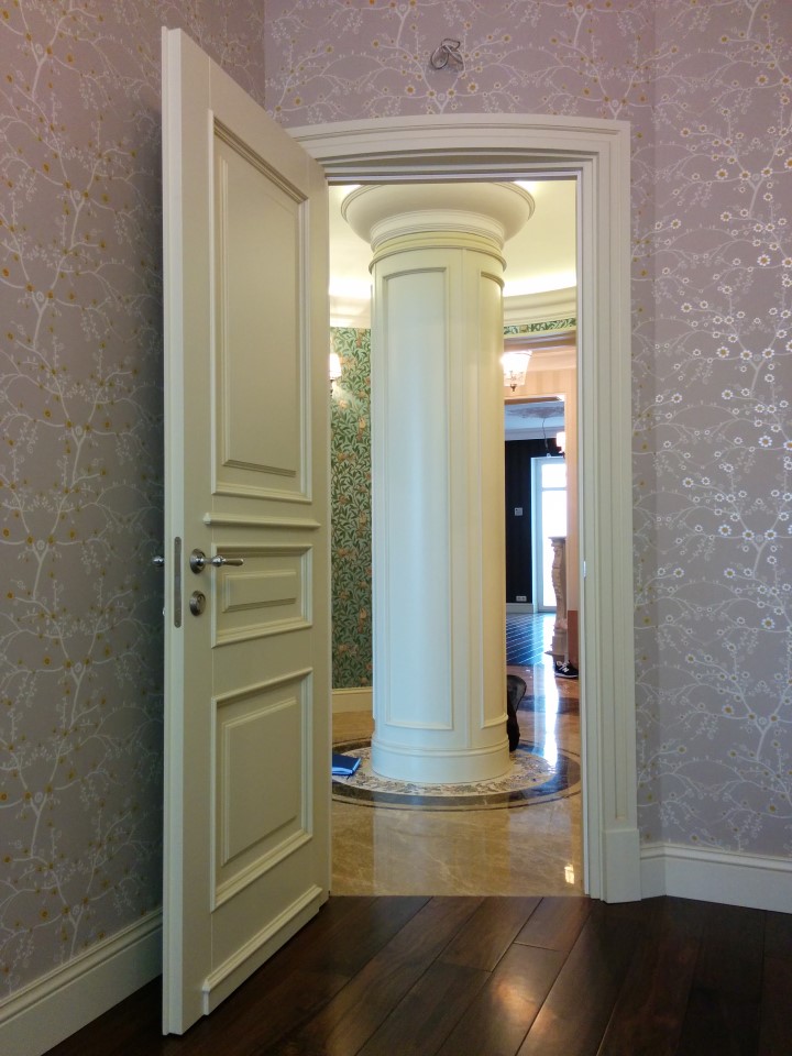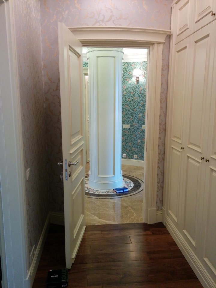 Смонтировали радиусные дверные блоки, межкомнатные двери, установили дверную накладку на входе. Под декоративным радиусным обрамлением колонны «спрятан» несущий конструкционный столб, уютно расположившияся по центру квартиры 🙂
