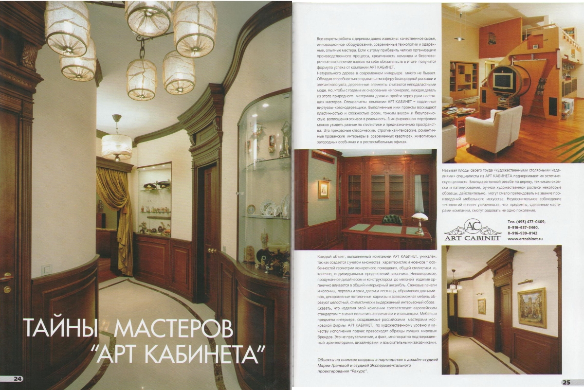 Наши изделия в журналах: «ELITE Территория интерьера» № 10 за 2006 г. Статья «Полет во сне и наяву» / «PRO INTERIOR» ДИЗАЙН и ДЕКОР. Статья «Тайны мастеров из «Арт Кабинета» / «Лучшие интерьеры» №80 за 2009г. статья «Преобразовывая границы» / «SALON interior» №4 за 2010 г. Статья «Логика комфорта» / «SALON interior» №4 (159) за 2011г. статья «…И жить, и работать»