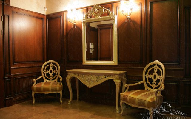 Роскошный интерьер элитного особняка выполнен в классическом стиле. Отделка декоративных элементов сусальным золотом, использование стеклянных элементов с широким двусторонним фацетом позволили добиться воздушного, солнечного и яркого интерьера. Это настоящее произведение столярного искусства. Двери, порталы, стеновые панели, резьба и декоративные элементы выполнены с соблюдением высочайших стандартов качества, предъявляемых к столярным изделиям, выпускаемым на нашем предприятии. ...