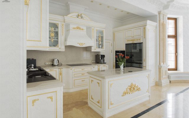 Изысканный классический кухонный ансамбль, выполненный в единой стилистике с остальными столярными изделиями особняка. Сложная, ажурная резьба и декоративная раскладка фасадов вручную покрыты сусальным золотом, использована высококачественная австрийская фурнитура. Кухонные шкафы изначально сконструированы под встраиваемую технику, выбранную заказчиком. ...