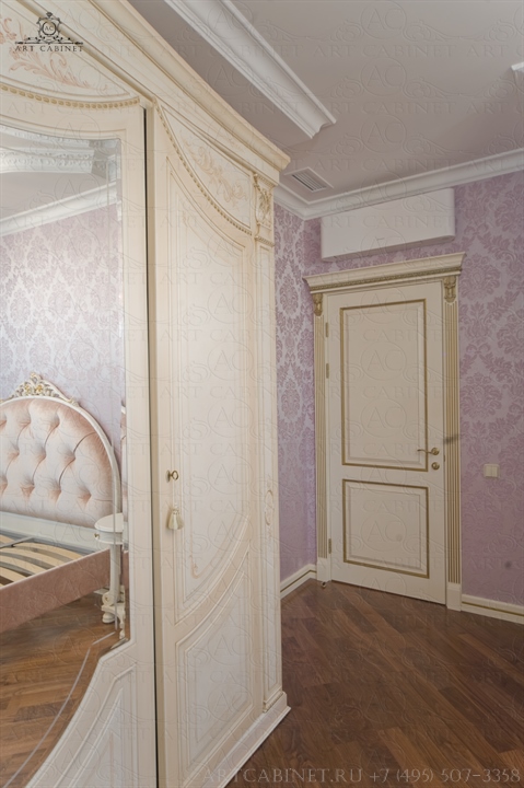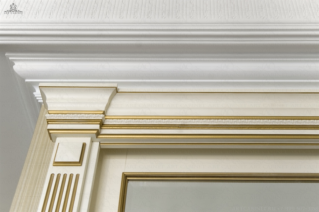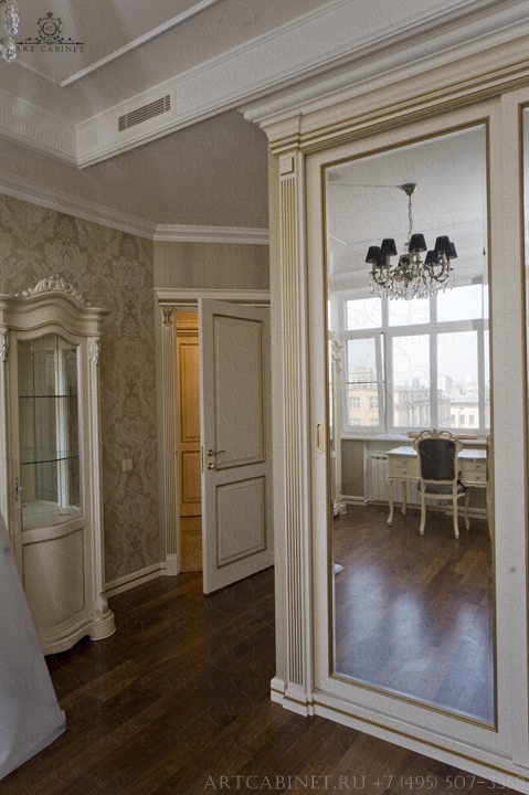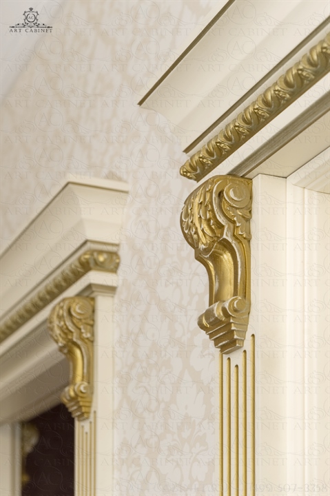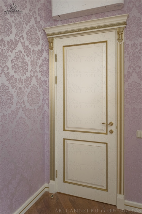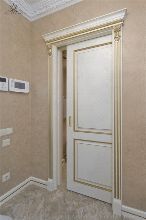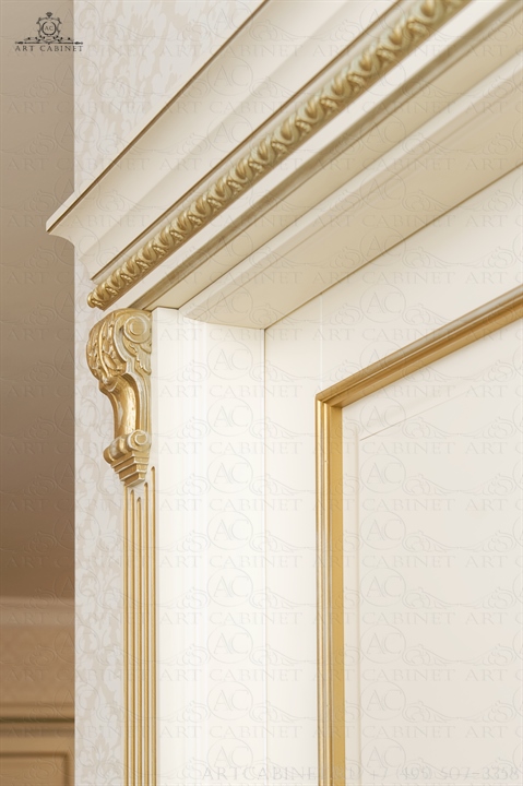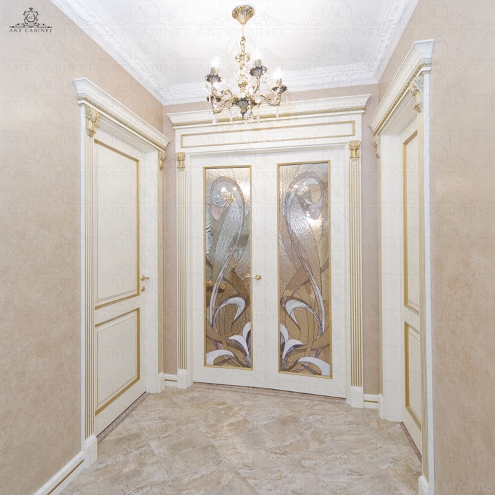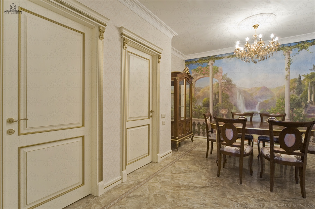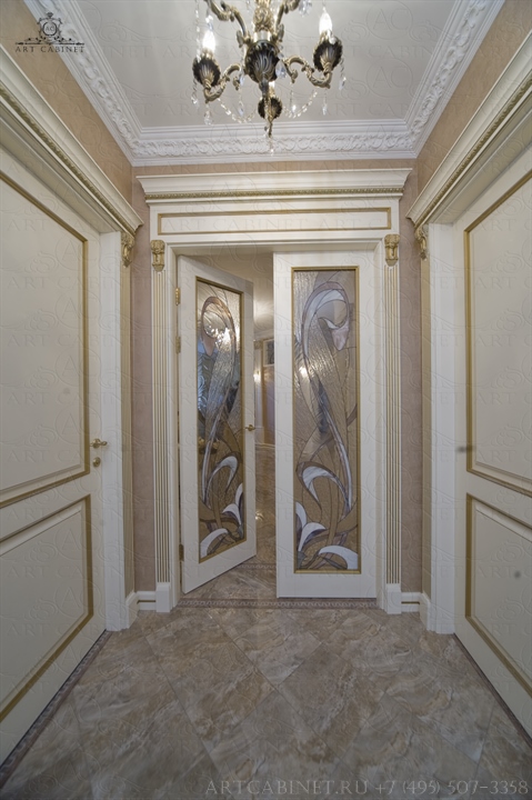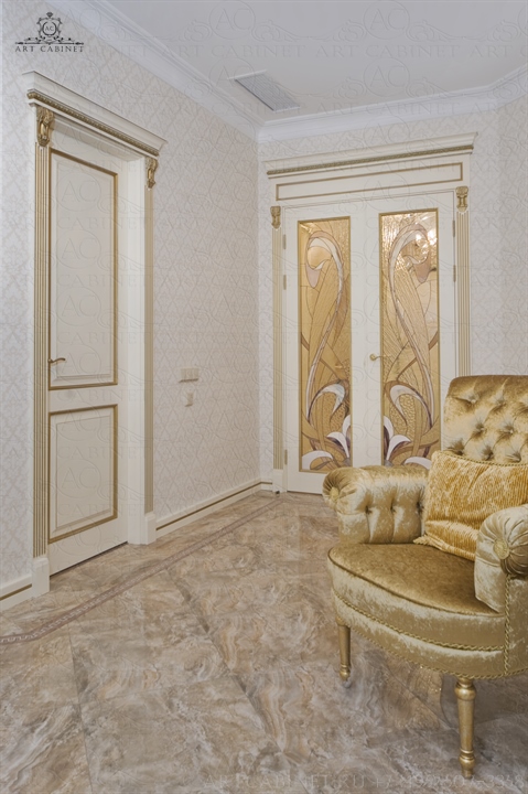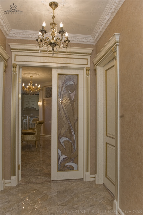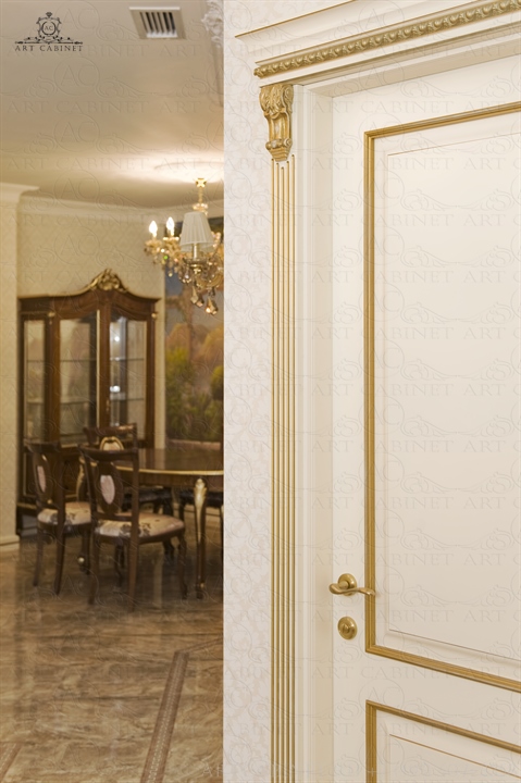 Для этой просторной и уютной квартиры нами были изготовлены раздвижные и распашные межкомнатные двери в классическом стиле, плинтуса, карнизы, фасадные части шкафов и элементы для итальянского кухонного гарнитура, уже установленного заказчиком. Отделка светло-кремовой эмалью с золотой патиной, широкие карнизы, использование витражей и элементов резьбы придали изделиям благородный аристократический вид нестареющей классики.