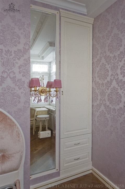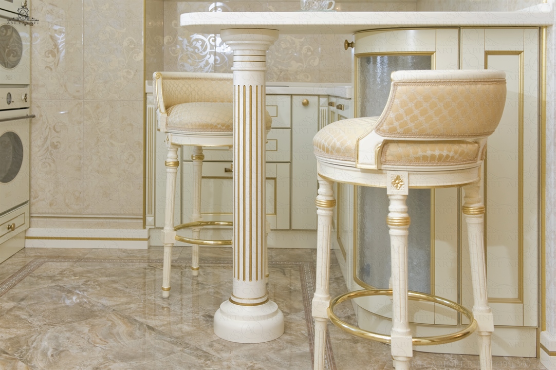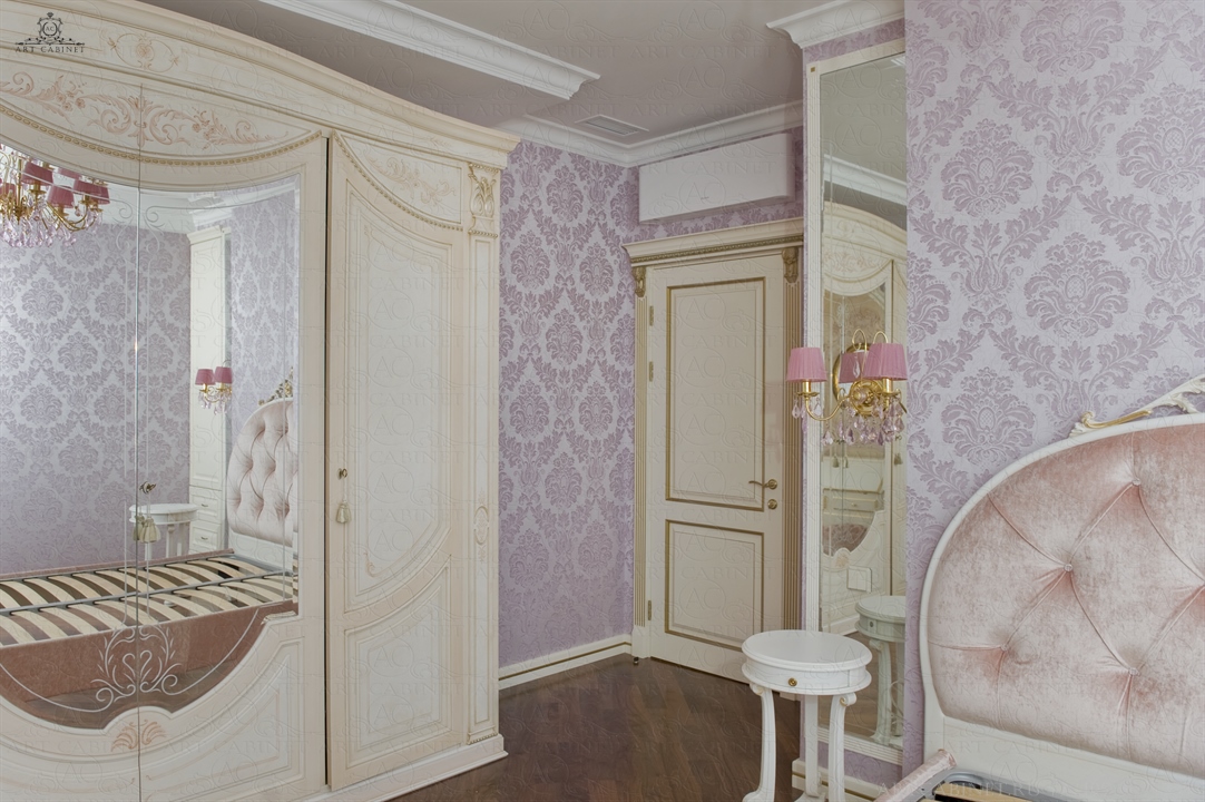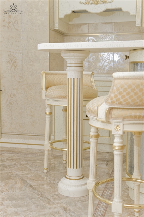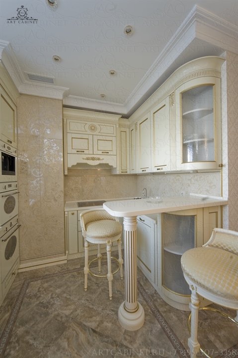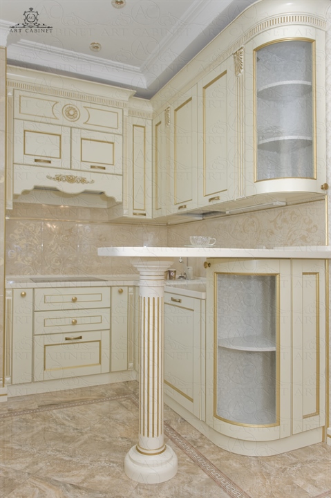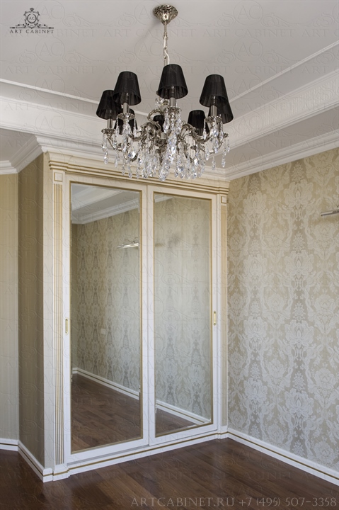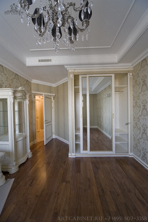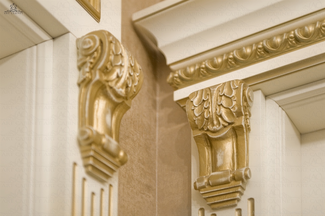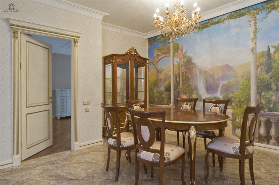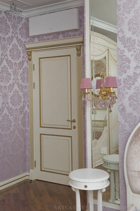 Для этой просторной и уютной квартиры нами были изготовлены раздвижные и распашные межкомнатные двери в классическом стиле, плинтуса, карнизы, фасадные части шкафов и элементы для итальянского кухонного гарнитура, уже установленного заказчиком. Отделка светло-кремовой эмалью с золотой патиной, широкие карнизы, использование витражей и элементов резьбы придали изделиям благородный аристократический вид нестареющей классики.