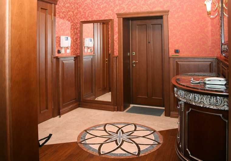 Далекий 2004 год, сохранилось всего несколько фотографий одного из первых объектов нашей компании. Аура уюта и теплоты классики начинается с самого порога: панели, карнизы, пилястры, порталы, изготовленные по индивидуальным эскизам, удачно сочетаются с тоном текстильных обоев, оттеняющим красоту и текстуру дерева. Классический домашний кабинет с массивным кабинетным столом и библиотекой.