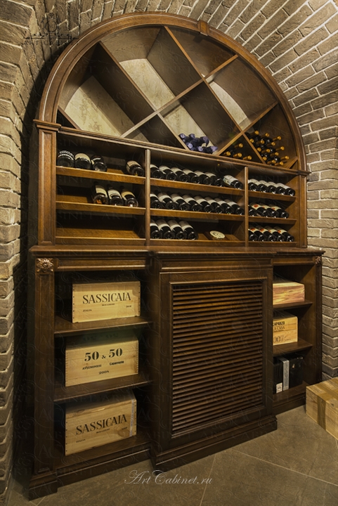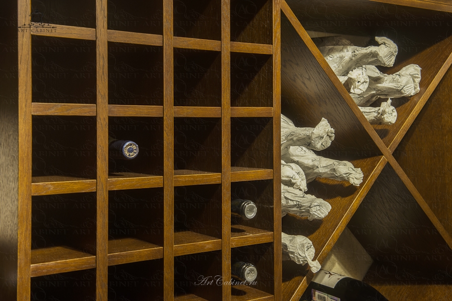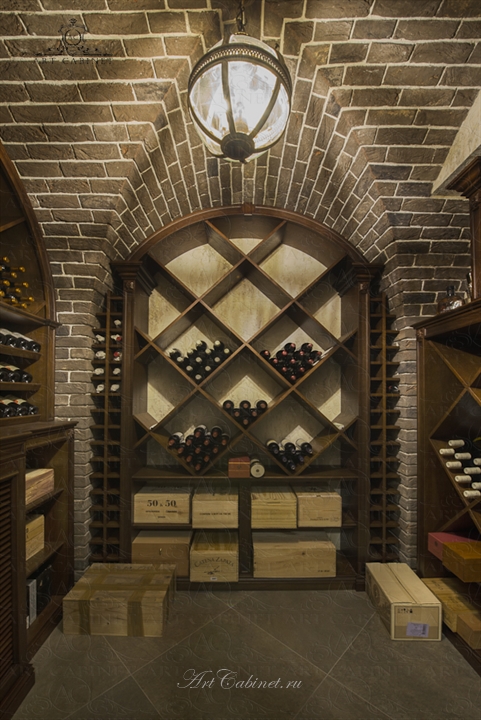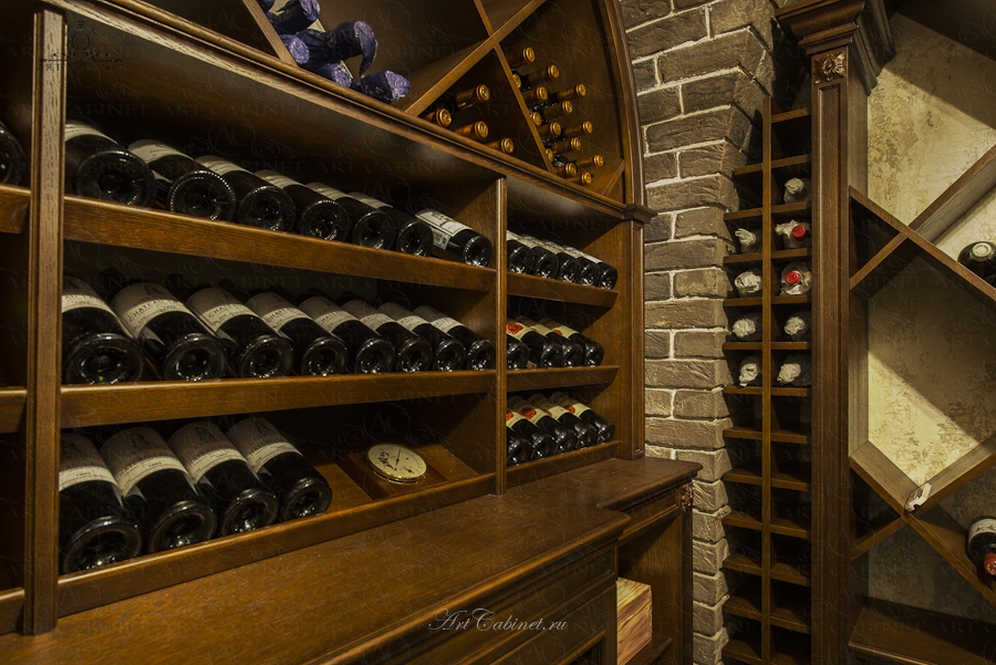 Одно из любимых, фирменных направлений нашего производства. Сложная кирпичная кладка винного погреба делала создание этой винотеки весьма непростым заданием. Тем интереснее было достигнуть нужного результата: дубовые винные стеллажи идеально вписаны в арочные кирпичные своды, детально продуманы и просчитаны все полки, ниши, ящики. Редкие вина постепенно занимают свои постоянные места в этом винном погребе превращая его в настоящее хранилище для авторской винной коллекции хозяина дома.