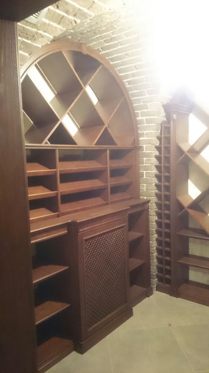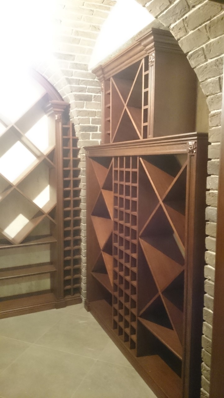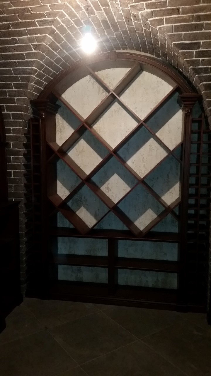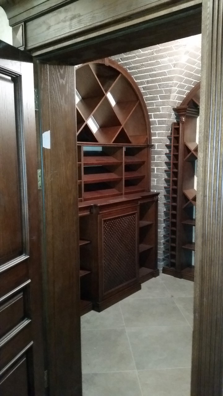 Винная комната в загородном особняке. В арочные ниши подвала вписаны винные стеллажи и шкафы для хранения вина. Винный погреб практически готов, монтаж был непростым из за сложной формы арочных проемов в кирпичной кладке, примыкающей к винным шкафам.