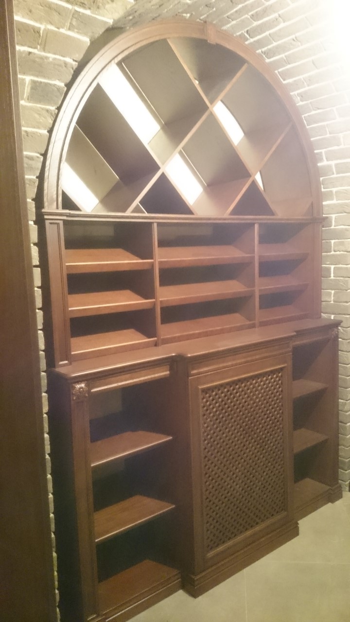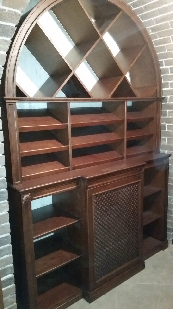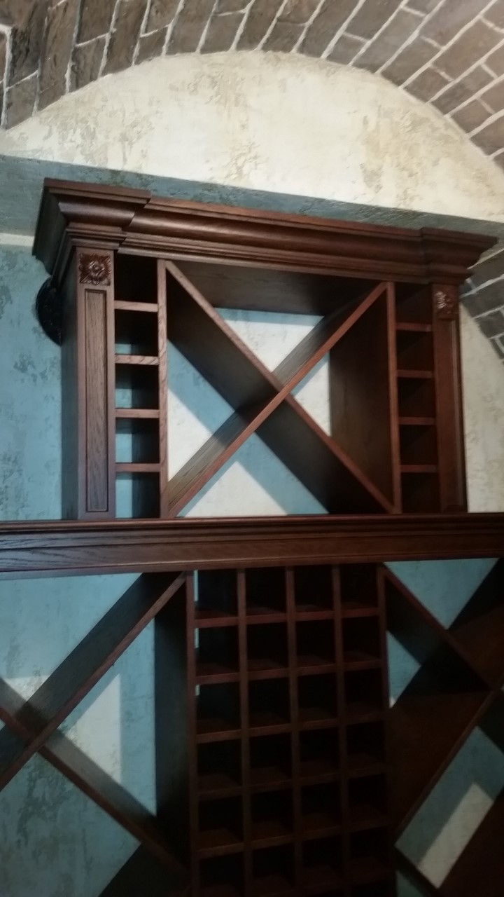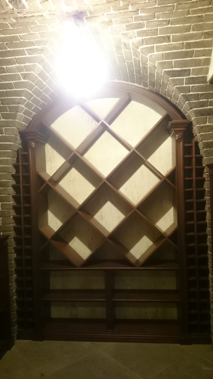 Винная комната в загородном особняке. В арочные ниши подвала вписаны винные стеллажи и шкафы для хранения вина. Винный погреб практически готов, монтаж был непростым из за сложной формы арочных проемов в кирпичной кладке, примыкающей к винным шкафам.